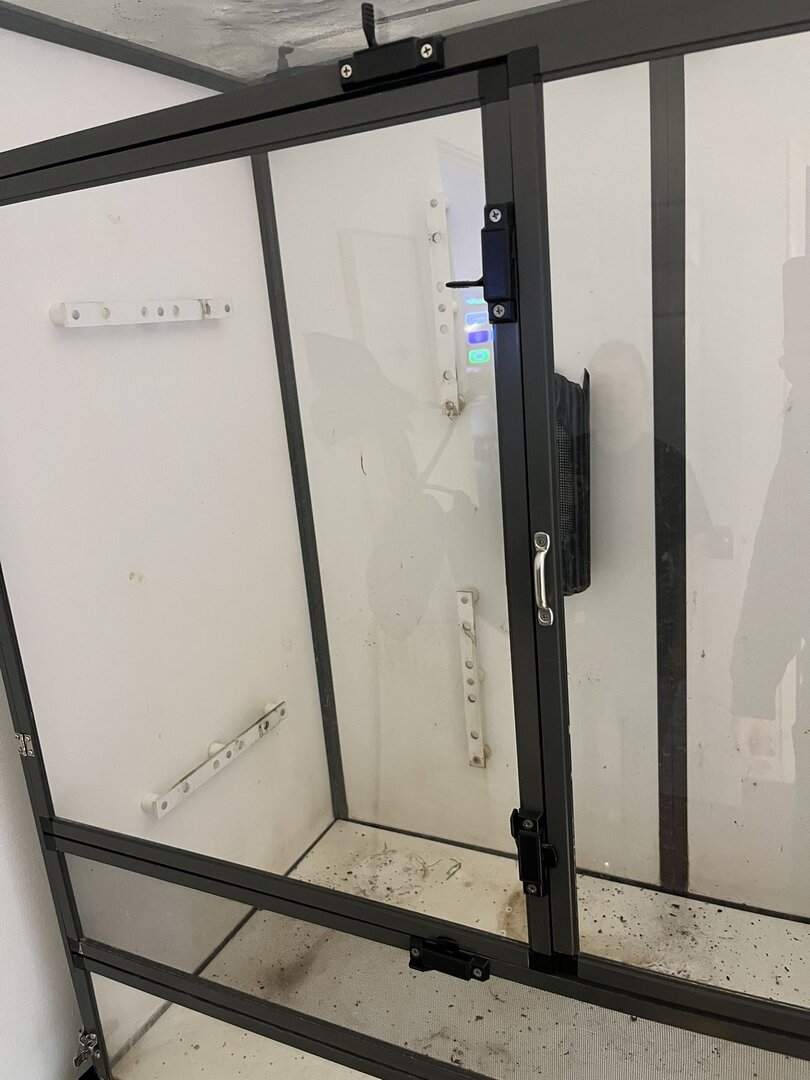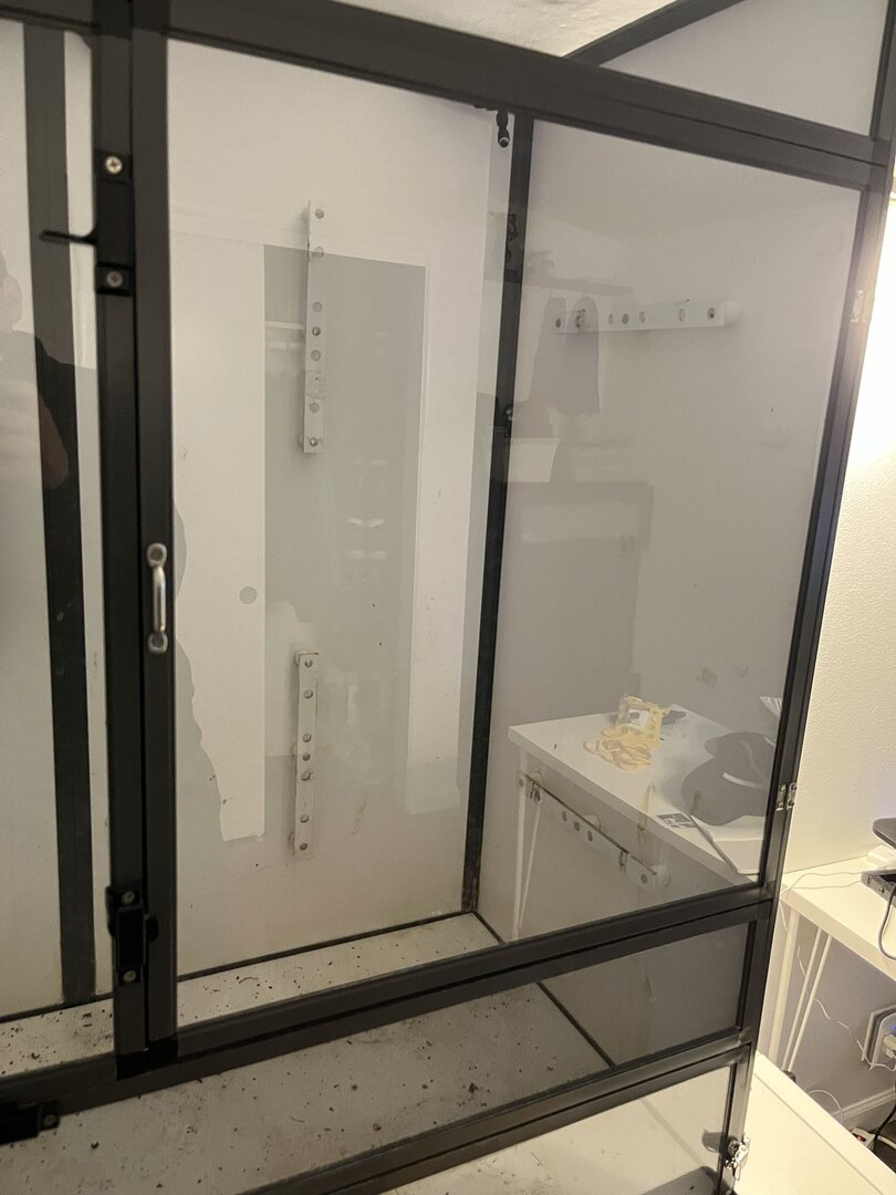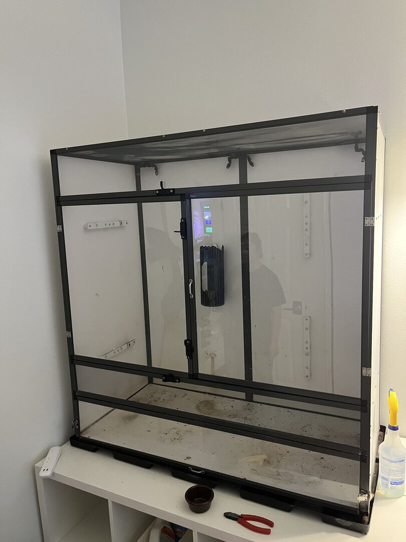 What do you set your enclosure on? My current cage is custom built(another amazing find by my hubby!) and sits on legs. I had to tape cardboard boxes over the front and side of the screen as our new cat Dorito(or as my husband calls him when he's good: Cool Ranch and bad: Nacho cheese🤦‍♀️) decided he wanted to make friends with Lou and kept climbing the cage😱!!This cage will definitely need something strong! Gotta find a different spot for it. Dining room isn't going to cut it. Also, I have a large Pothos and a few fake plants. I have some fake branches but was wondering what your favorite type is if you have to choose a fake one?