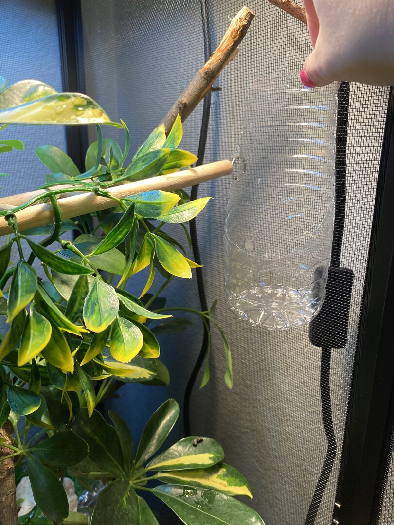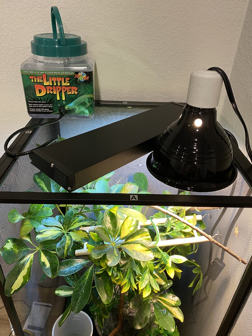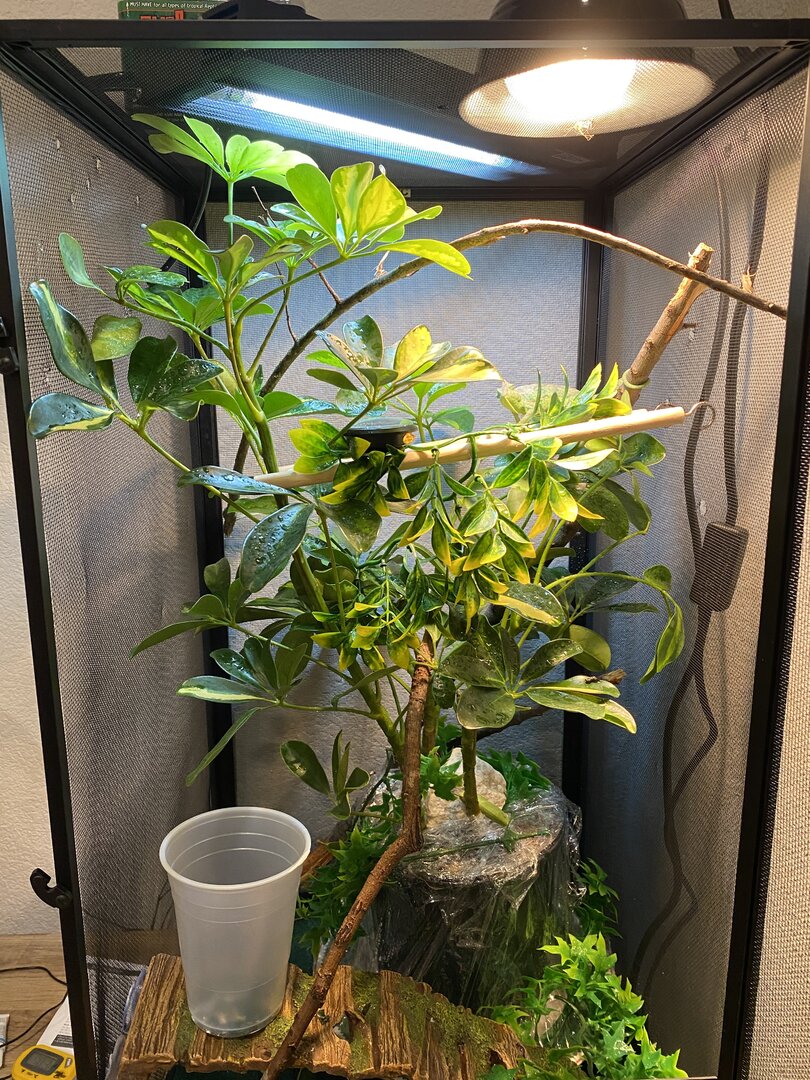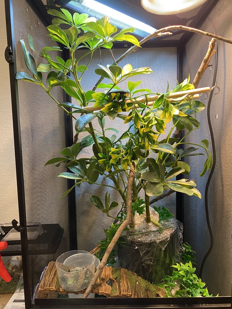 I have a smaller cage 16x16x30 for now just bc of how small he is and i want to possibly custom build a bigger one so that he’s able to roam around! I’ve read a lot about using only live plants (no fake at all) but i also can’t get plants along the edges without them dying due to them not being in a pot and in this cage, there’s no possible way of fitting more than one plant in there! Ive also had my husband cut down sticks from a tree and clean them to put in there! I’m up for new ideas and places to get certain things bc i’ve looked EVERYWHERE!!! i will post pictures below of my set up!