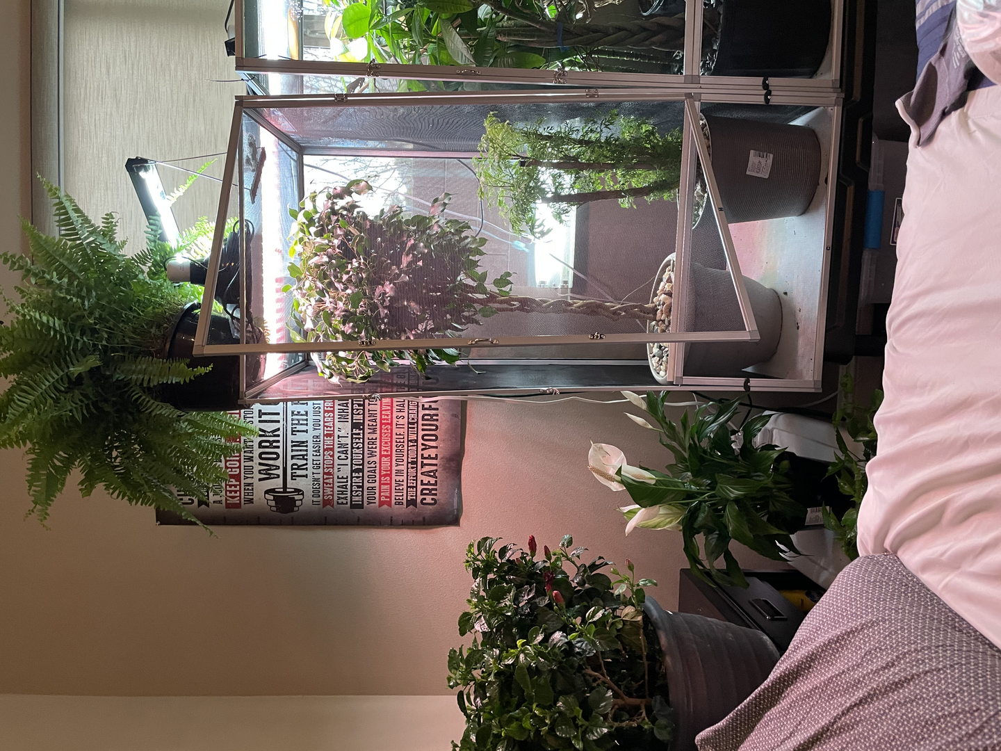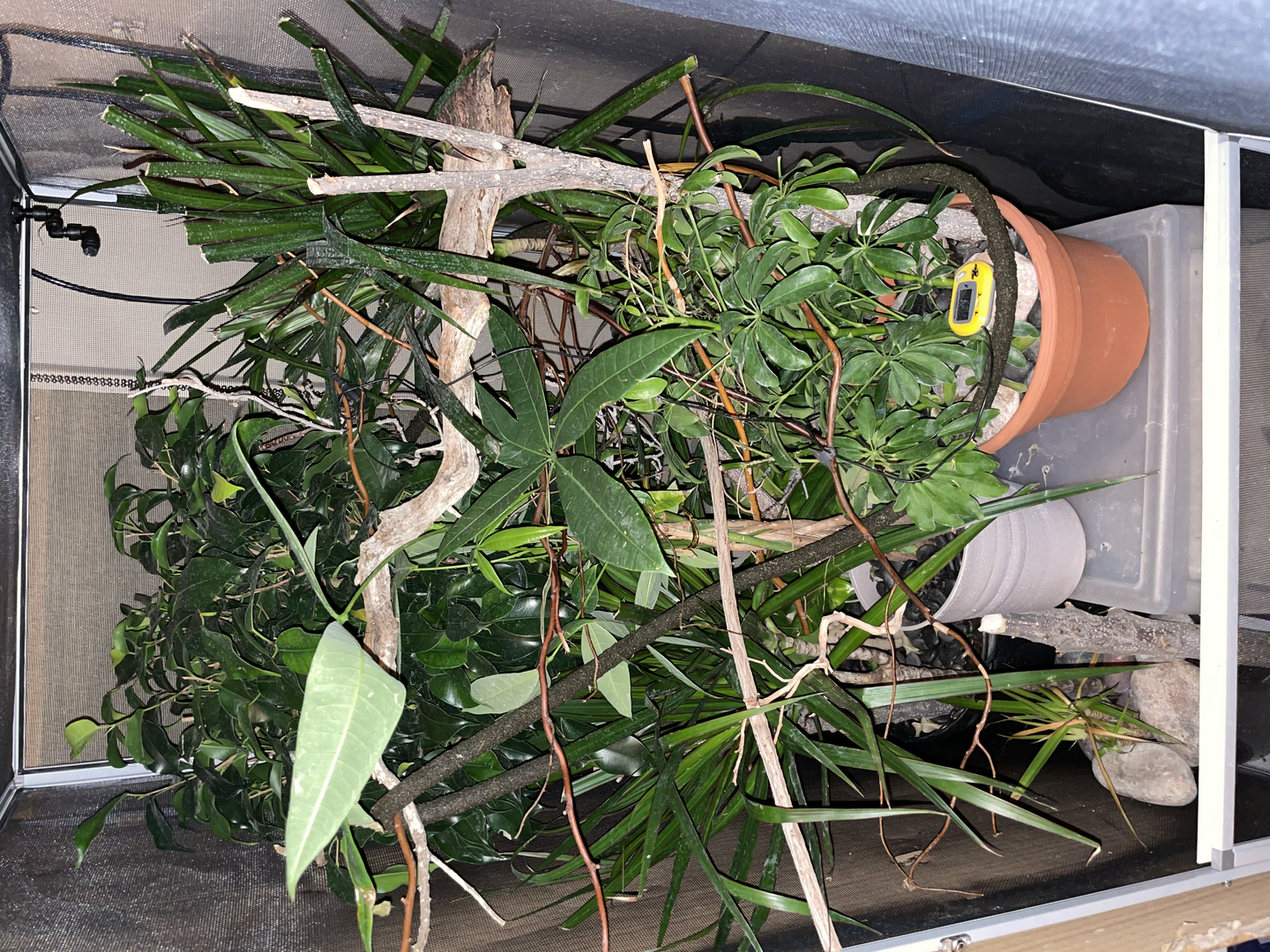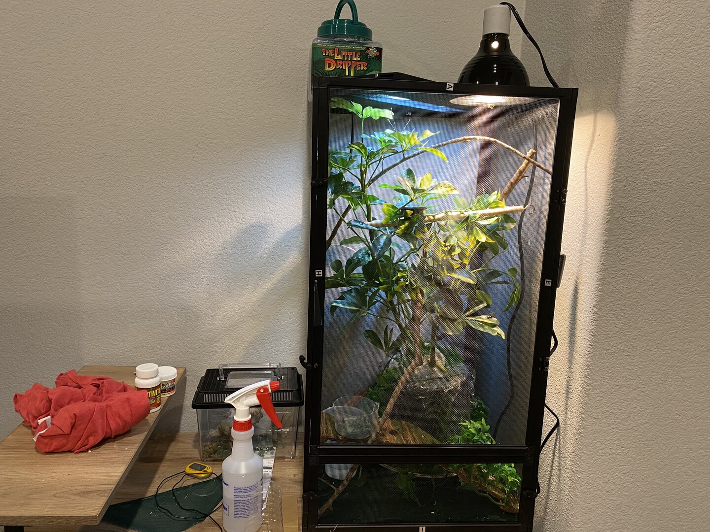 I have a smaller cage 16x16x30 for now just bc of how small he is and i want to possibly custom build a bigger one so that he’s able to roam around! I’ve read a lot about using only live plants (no fake at all) but i also can’t get plants along the edges without them dying due to them not being in a pot and in this cage, there’s no possible way of fitting more than one plant in there! Ive also had my husband cut down sticks from a tree and clean them to put in there! I’m up for new ideas and places to get certain things bc i’ve looked EVERYWHERE!!! i will post pictures below of my set up!