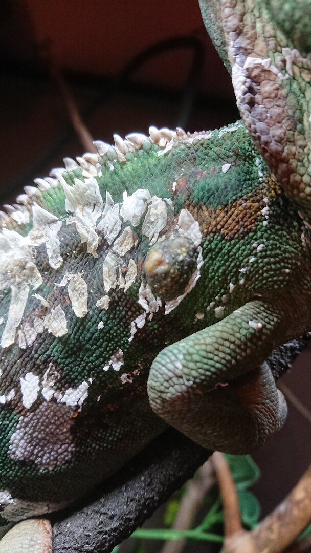 Looking for advice. I have a veiled chameleon, named karma, had him for a few years now. He's a pretty healthy guy, feeds about twice a day (normally between 3 and (sometimes) 6 hoppers!! I give him calcium at least once a week, has a humidity control system but spray him at least once or twice a day. Had a set up a while back which he had for a long time but fairly recently has burns on his side (see previous post) but has pretty much cleared up after treatment from the vet and a whole new viv and a whole new set up. He's had a small yellow spot on his side for years, was told it was just a "calcium" spot and was nothing to worry about. But I've noticed a pretty big lump (about The size of a pea) on his side now where the spot is so quite concerned. Don't have a reptile specialist in our local vet so looking for some advice. I'll post some pics!! He's been shedding his skin for ages now and it hasn't stopped since healing up his side from the burn, don't know if that would be connected to his shedding. Otherwise he's a pretty happy wee guy, interacts with us well and still pretty active, gets plenty of light during the day and in darkness at night and sleeps well. Any help or advice would be greatly appreciated. Thanks in advance for any advice.