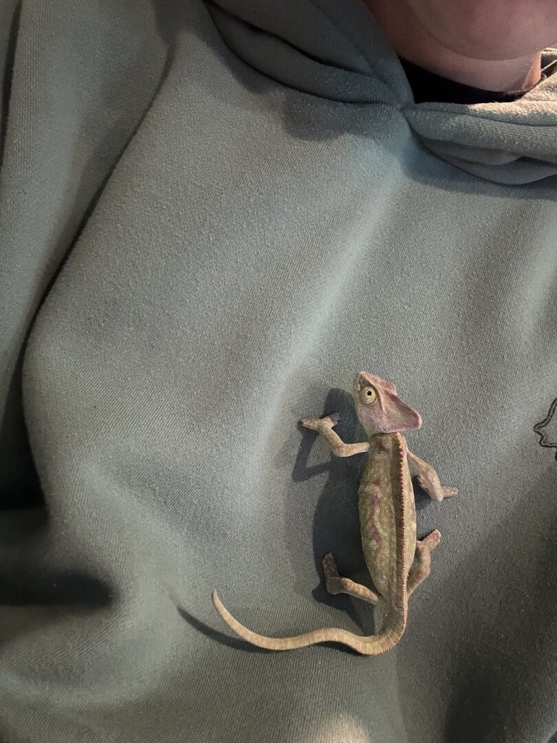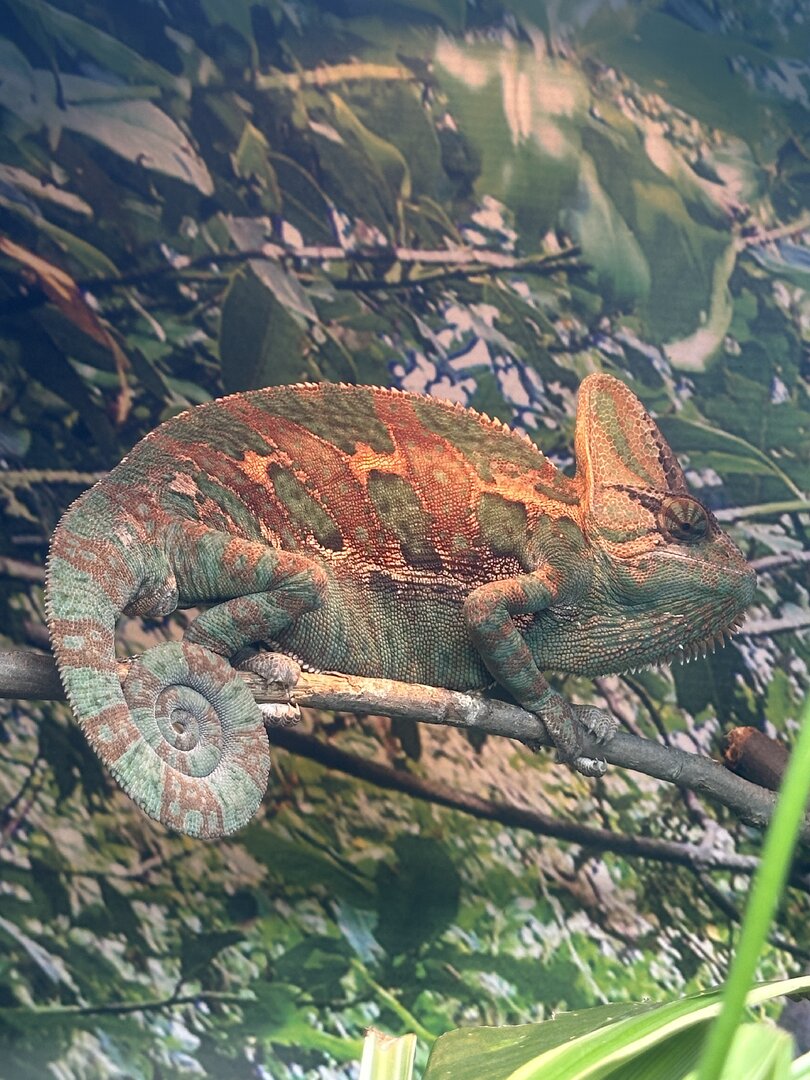 I think I just realized that Mr. Chameleonaire doesn’t approve of my red sweatshirt lol. It’s the only red thing I wear and anytime he saw me in it he would get down really flat and lay sideways on a branch to hide from me. Have any of you guys ever noticed something similar with your chams? I have thought of it before tho, they change colors to communicate so I wonder what they think of us wearing different colors all the time? Nice tail curl pic included for your enjoyment.