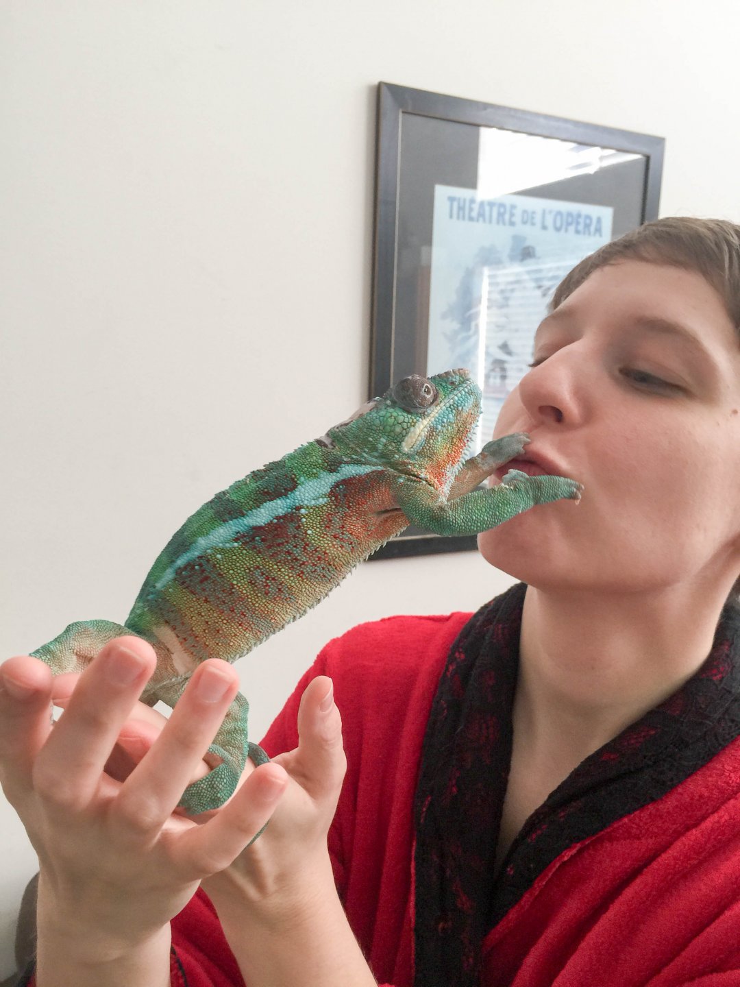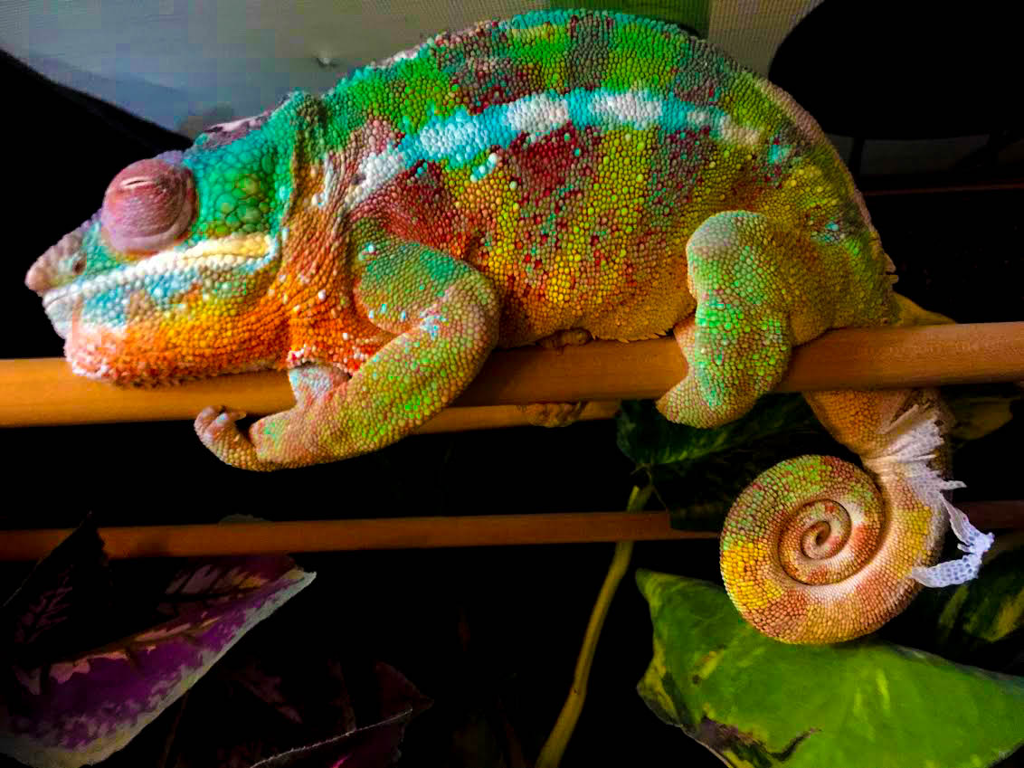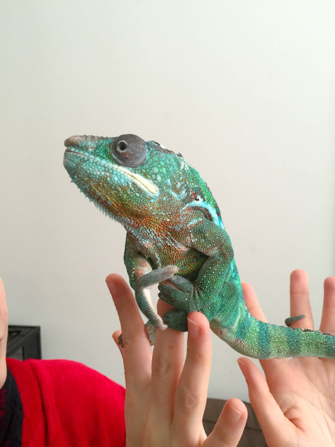 I spoke to the vet because I was concerned about his weight as well. She said after the appointment he is healthy as all can be but if he gains anymore weight I'll have to put him on a diet. His feeding schedule is the same for the other panthers. He's just a big dude and also a gentil giant.What did the vet say? He looks bloated with gular edema. If it isn't just edema, he looks obese. From your picture, it looks like both edema and obesity, but I'm only looking at one picture of a sleeping chameleon and I'm not a vet.