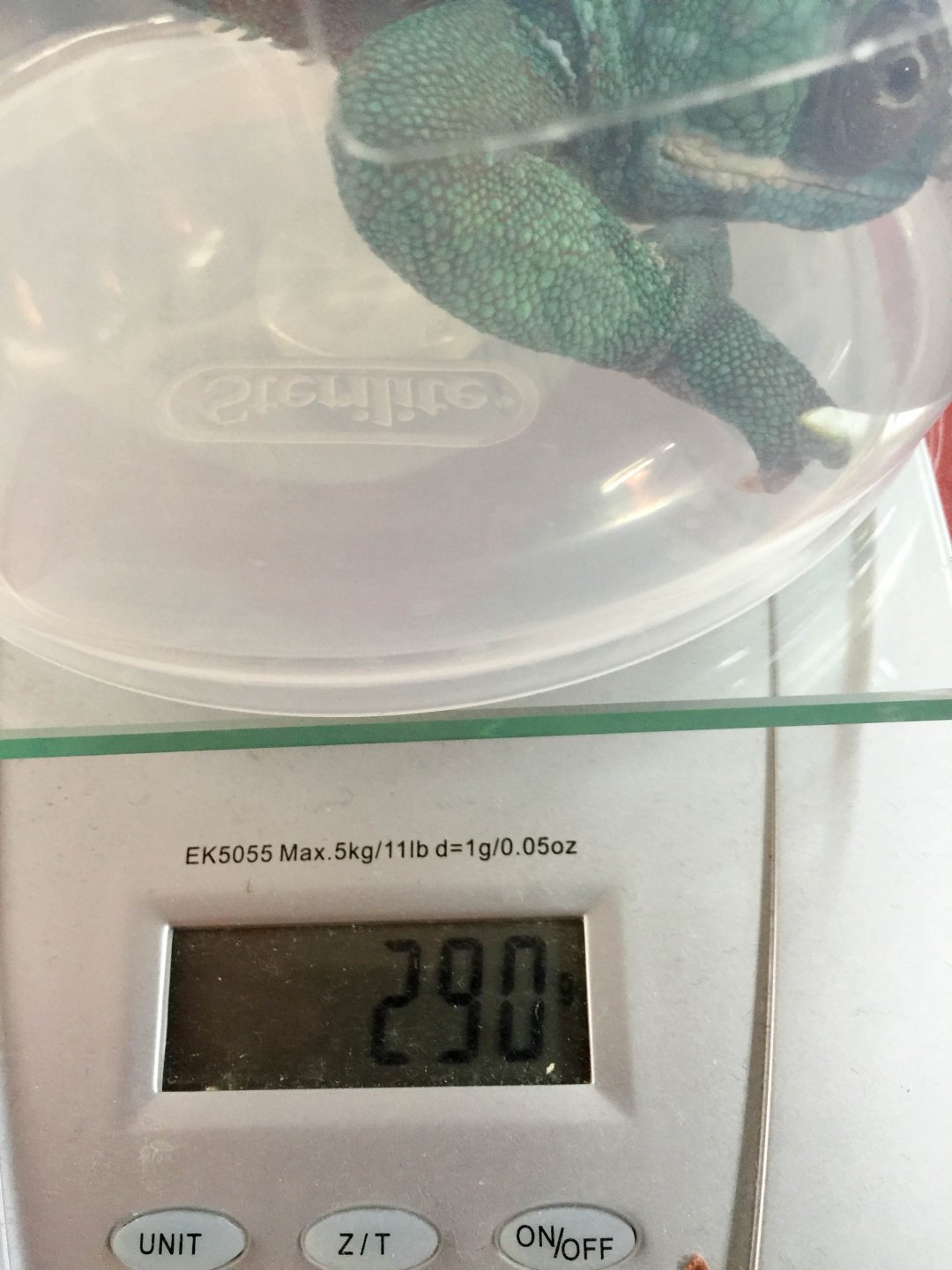 Major Tom had a vet checkup this morning and weighed in at 290g!!!!! What the...............He dwarfs all my other panthers by a lot!