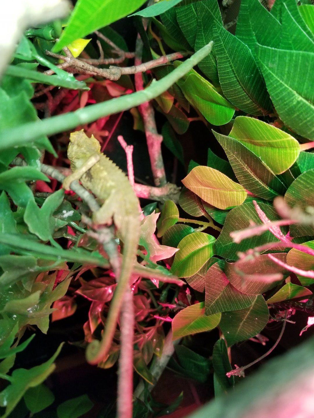 Need help figuring out how to make my new baby Jacksons cham relax. I have had him for two weeks now and I believe he's around 4 months old. When I first got him he was pretty much black and the lightest I have seen him is a golden brown. I keep the temp good and humidity is comfortable. Hes eating good but just stays about the same color all day. Is this normal? Any advice would be great! In one of the pictures he looks green but its the camera. That gold is the brightest I have seen him.