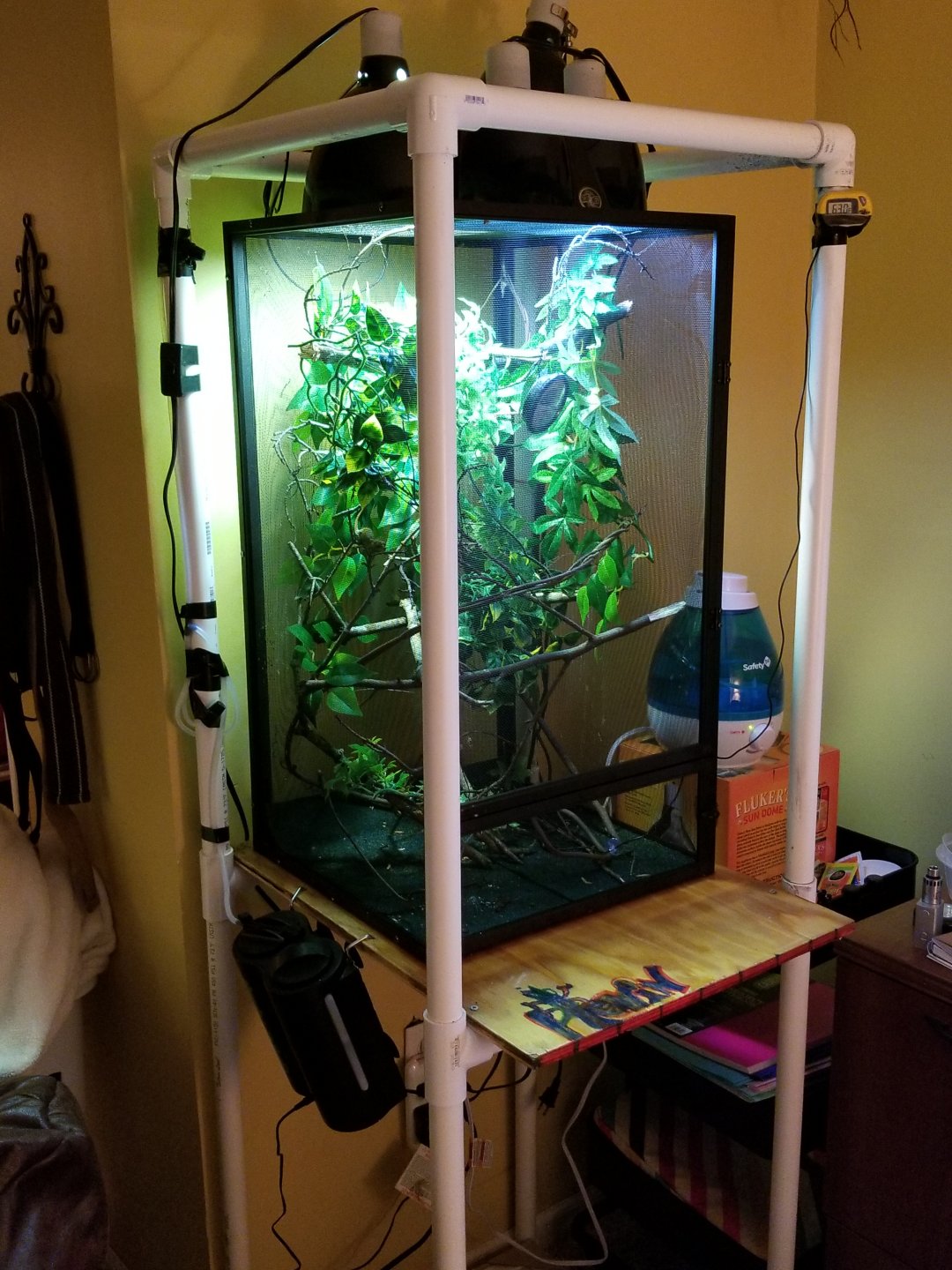 What is the humidity consistently on percentage wise? How many times are you misting and how long of a duration? To much humidity and to much uv light can cause eye infections just a heads up...your enclosure looks good by the way. If I was you I’d put a umbrella plant and some ivy or a ficus tree later on but in doing so you have to remove all the dirt to bare roots and clean the leaves and repot the plant with dirt from the pet store or organic soil no fertilizer at all is a must! Real plants make them settle and there is more places to hid in a real plant rather than plastic but there’s nothing wrong with plastic plants don’t get me wrong.