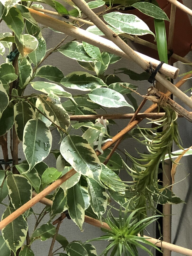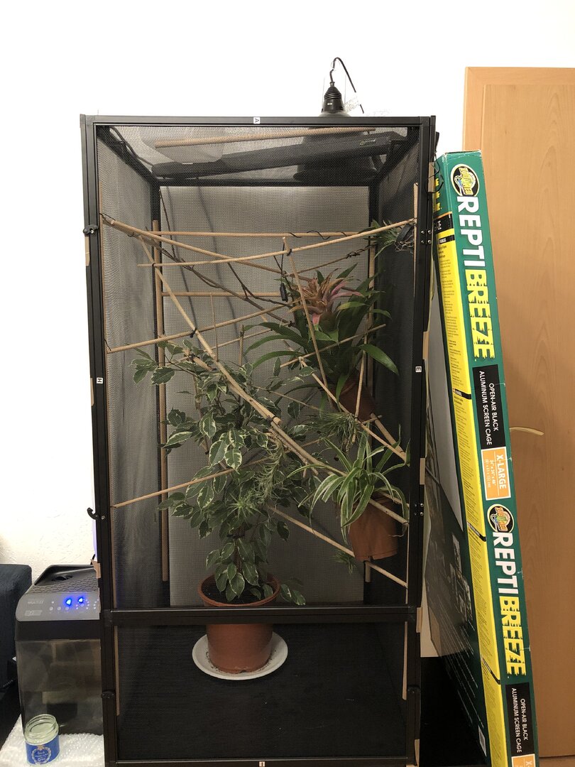 Current Problem - 1. He is extremely afraid of me the last days. I hold his feeding cup in a way he can see the bugs, he runs to my hand, eats, checks if I look at him and if I do he runs away, if I don’t he stays till he eats everything and then runs away, but he doesn’t allow me near him otherwise. Just looking at him makes him run for his life, let alone touch him and I never forcefully took him out or so I’m worried what would I do if we need to go to the vet. Also I have to put new plants in the cage, because 2 of the 5 died and the cage is empty-ish rn. How do I put in the new plants when I can’t take him out and he’s already scared to death ?