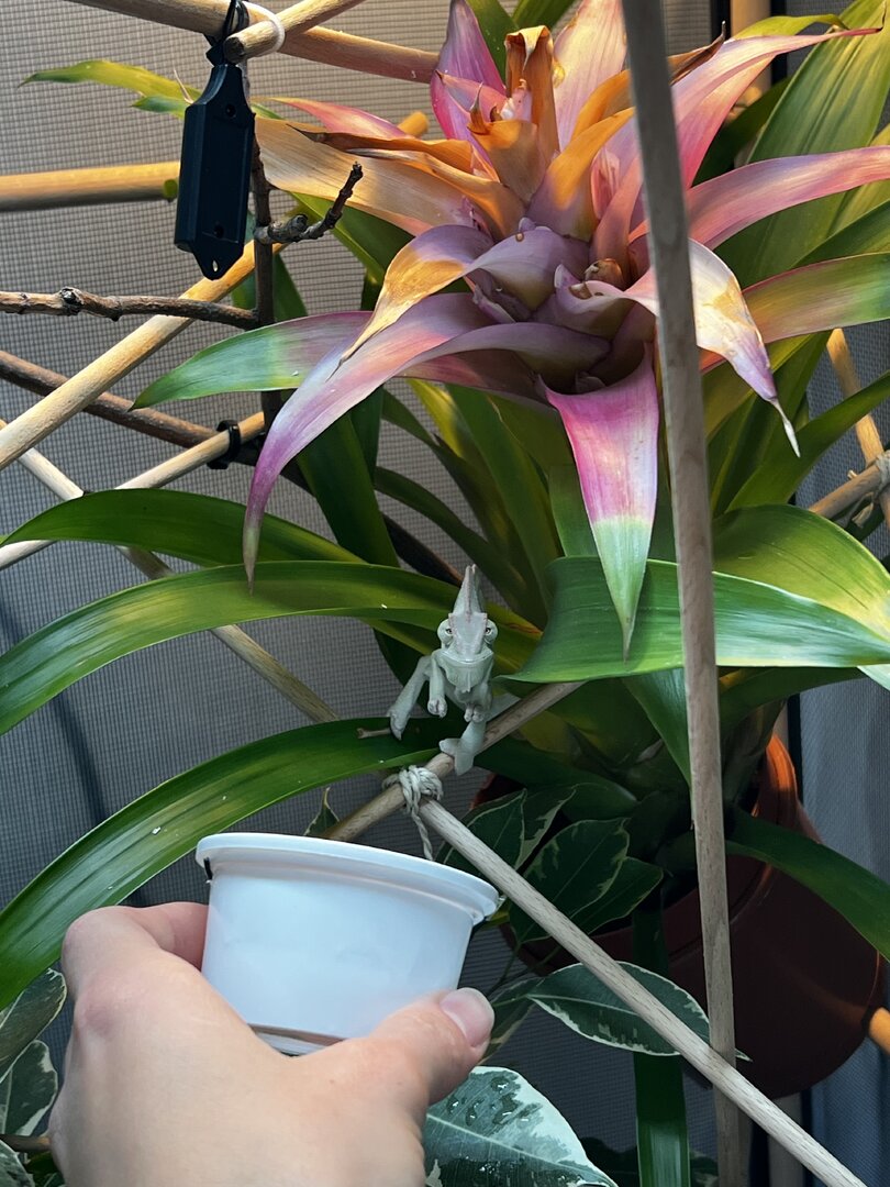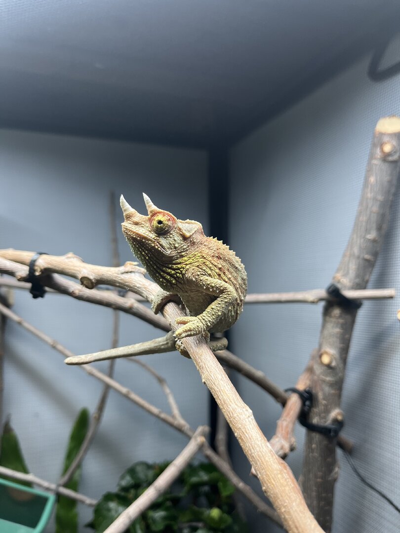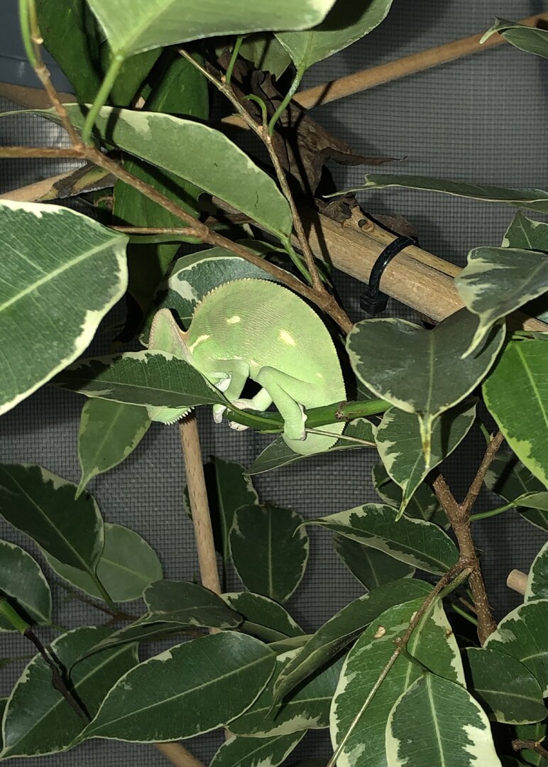 Here’s how lovely green he was till a week and half ago and now…. I would consider getting a feeder run or something that you can place in his enclosure and leave there for him to eat the bugs as he wants/needs without feeling vulnerable. For example my veiled doesn't seem to be afraid of humans, I hand feed her every feeding, she eats from the cup I offer and then just keeps hanging out. My panther is terrified of me, if I hand fed him it would cause a lot of stress so I place his feeder in his enclosure and leave him alone. Just putting the feeder in his enclosure he gapes at me. If he is eating quickly and running away that tells me he is nervous. (pics attached in previous post of my feeding stations to give you some ideas)