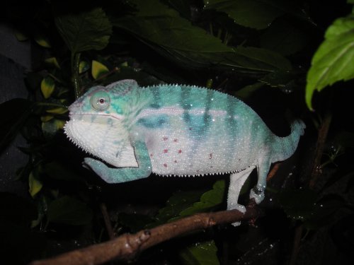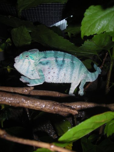 Local pickup prefered. If I have to ship him, I will not ship the cage. His name is Raz (because he has some small red dots on his rib area, had since he was a baby) and he is roughly 8 months old. I got him from ChameleonsOnly.com and he has been a joy ever since! Its just time to pass him along to someone who has the time to take care of him. I mist him 3 - 4 times a day and he gets fed a variation of crickets (small and large), mealeworms, silk worms and he has had fruitflys. I typically spray all around his plants and cage before I spray him (If I do at all). He is very active and bright in color. I give him a mix of calcium and a multi vitamin. The water sprayer I have will come with him, its from exoterra The backdrop on the back of his cage is I believe a 36H X 18L piece of faux stone. Theres a hibiscus and pothos plant in the cage, along with a couple of fake plants. Real and fake twigs for him to climb in all directions.