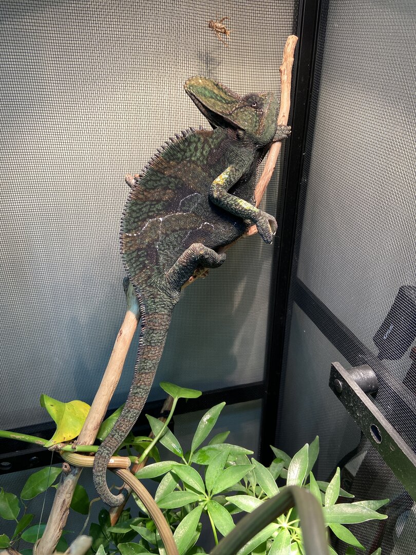 - Feeding - crickets. Dubia, horn worms, super worms, silk worms. Mostly silks and crickets- as he’s picky, but occasionally will eat supers and Dubias. Every other day feeding.