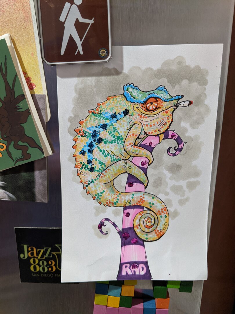 An illustration my old room mate did when they found out I was thinking about getting a chameleon. Only real criticism is the backwards curling tail![]()