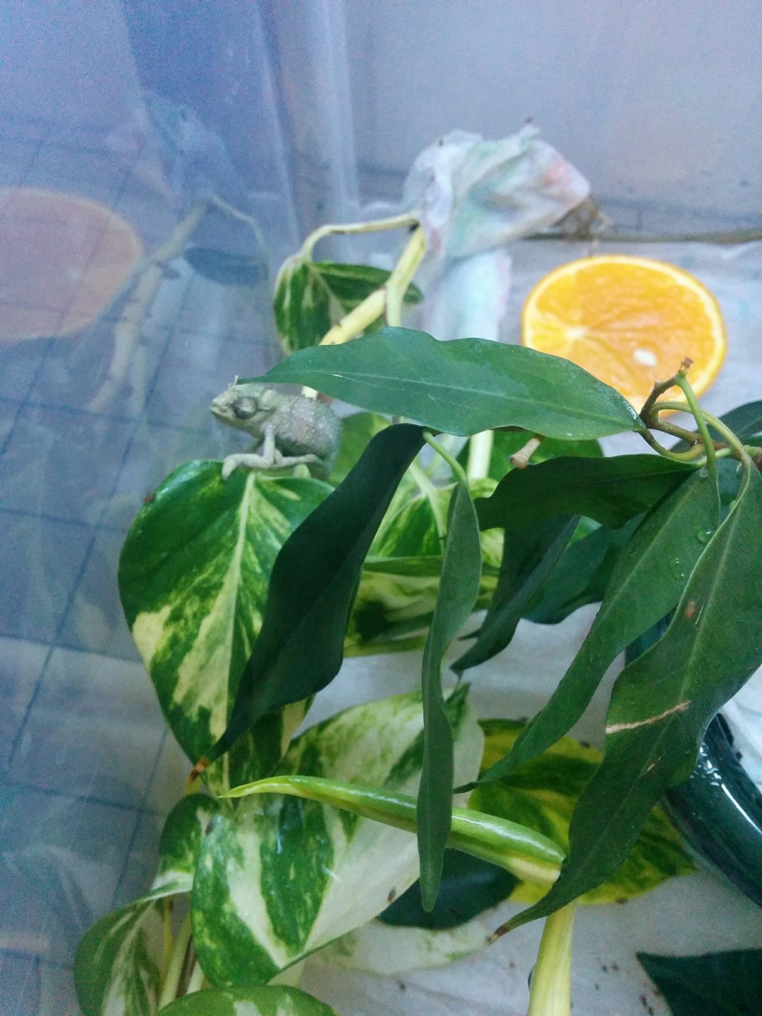 I´m thinking the temperatures are too high, but I´m not sure how to bring them down for the little guy. We have no AC at home, and I´ve read that fans aren´t the greatest for chameleons. Any ideas?