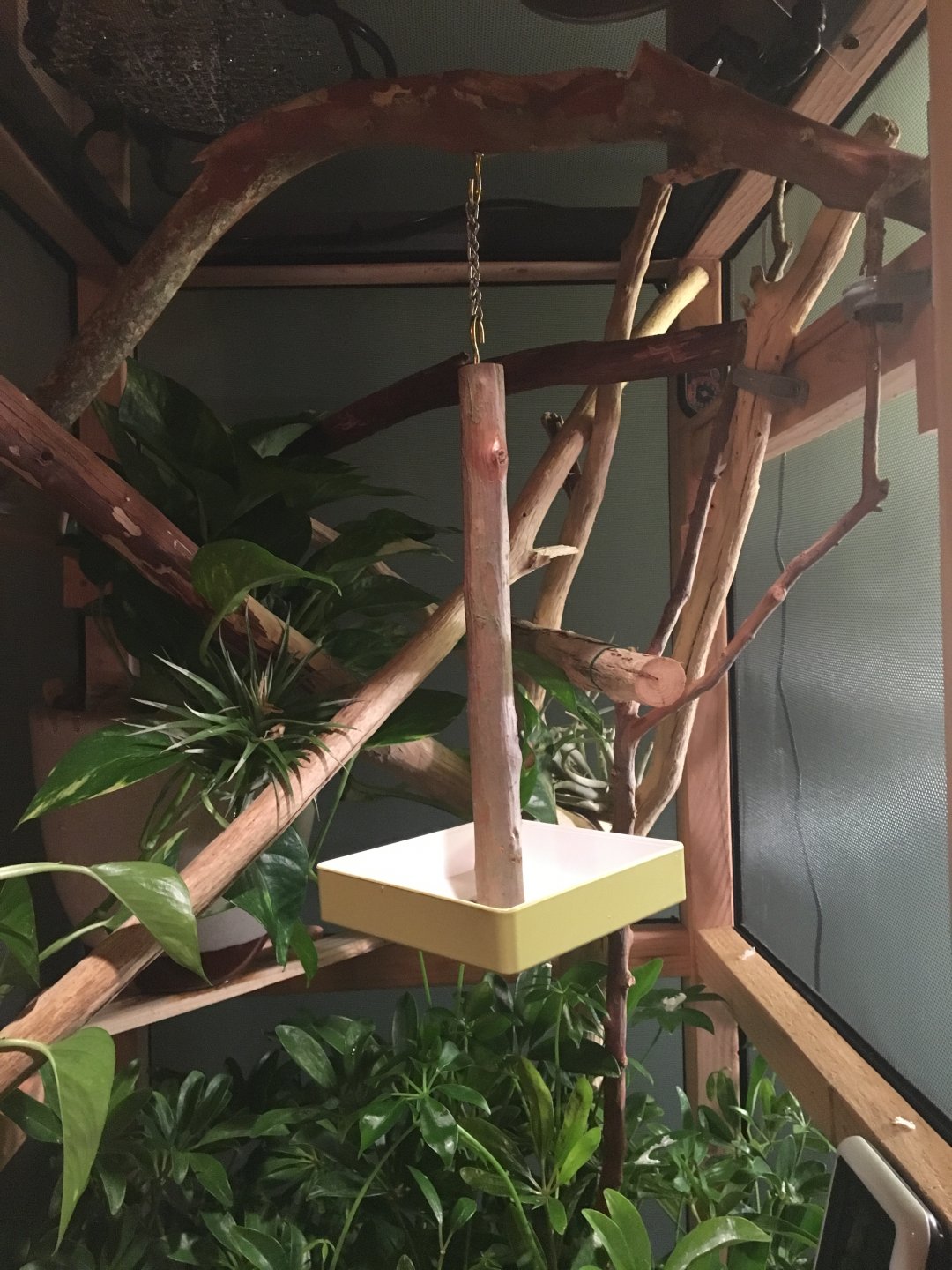 Also trying out a new style of feeder - Hoping it will afford a better opportunity for the Dubia roaches to scurry up that stick but still remain captive. We'll see!