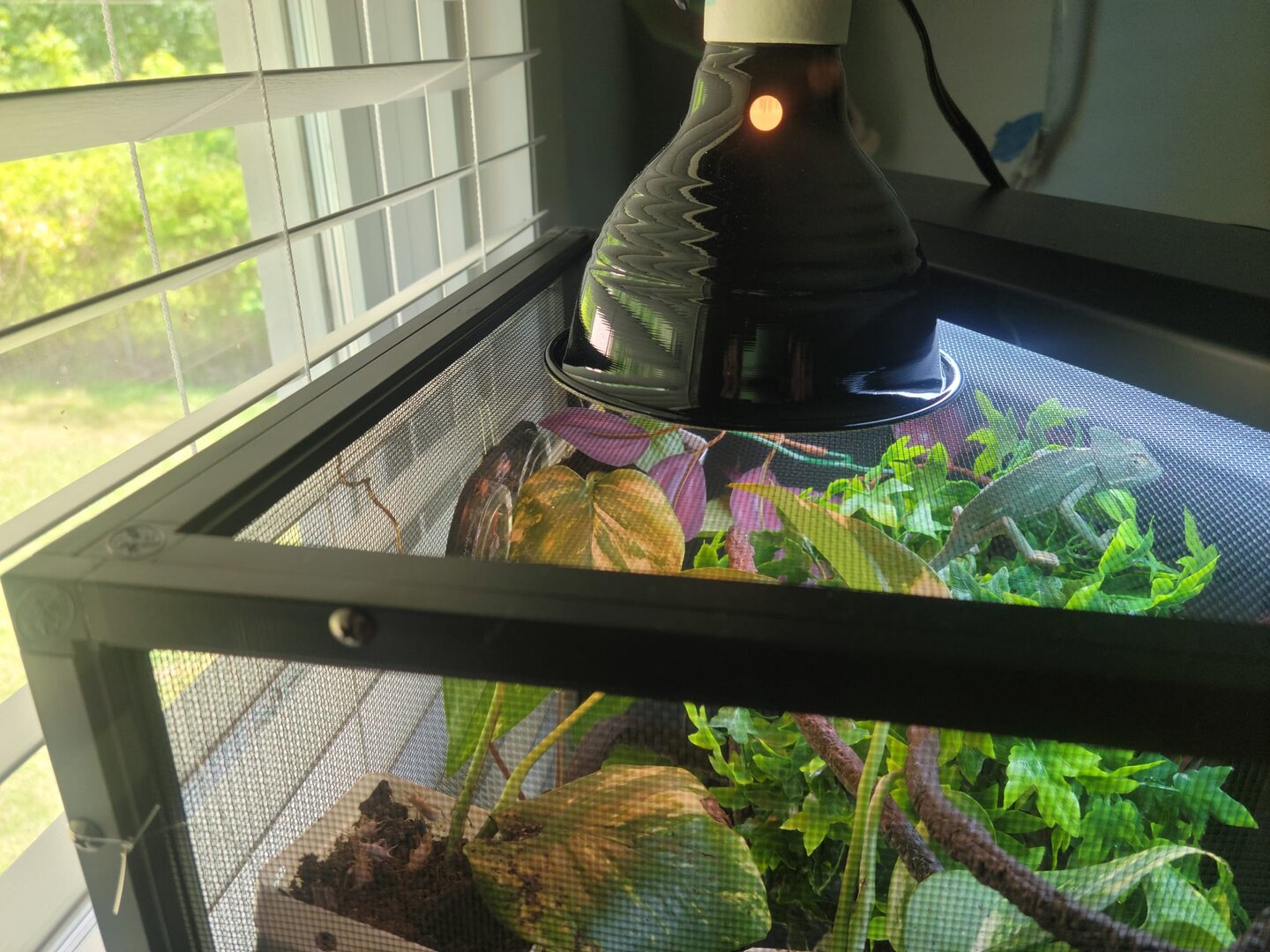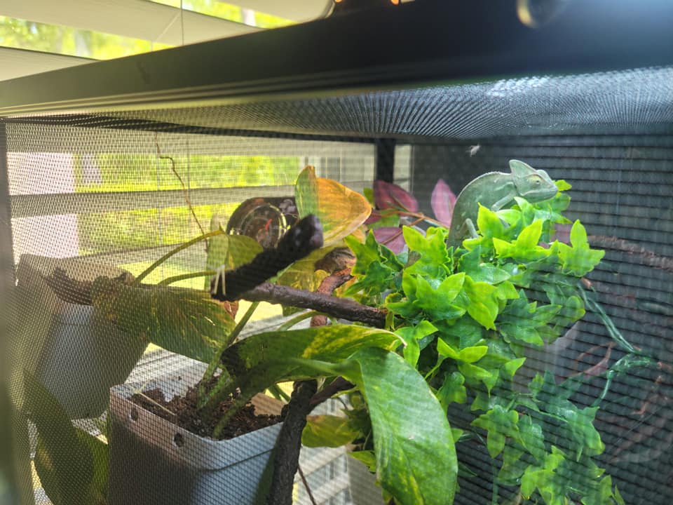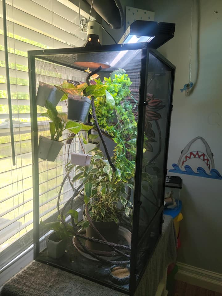 I am a new veiled chameleon owner and I am just curious how her husbandry looks to everyone. I've been told I'm wrong for getting her a reptisun T5 HO 5.0 bulb and that I should only use a 10.0 bulb. I noticed today she was sitting up really close to the light, so I've moved those branches/shrubbery down some so she won't be getting too close (that I can tell. I can not afford a UVB meter). These pictures were taken before I moved everything down a few inches. Please keep in mind the fake shrubbery will be gone soon, as once her live plants (pothos and ficus) grow enough to give her good cover, I will remove them. I tried to remove them already, and she really seemed unhappy about that as she likes to hide behind them. She also has not shown any signs of attempting to eat that shrubbery so I feel it is okay to leave it for now (please let me know if you think otherwise). I just mainly want to know if this looks okay, and if this lighting is truly good enough for her, given the situation. Otherwise, she seems to be totally fine but I want to make sure I won't be putting her at risk of MBD or anything.