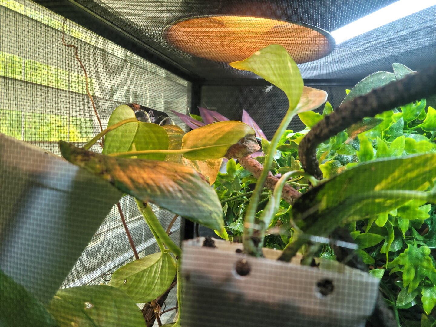 Plants are golden pathos attached to the sides of the cage and a ficus Benjamina on the floor in the middle.