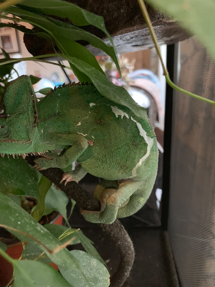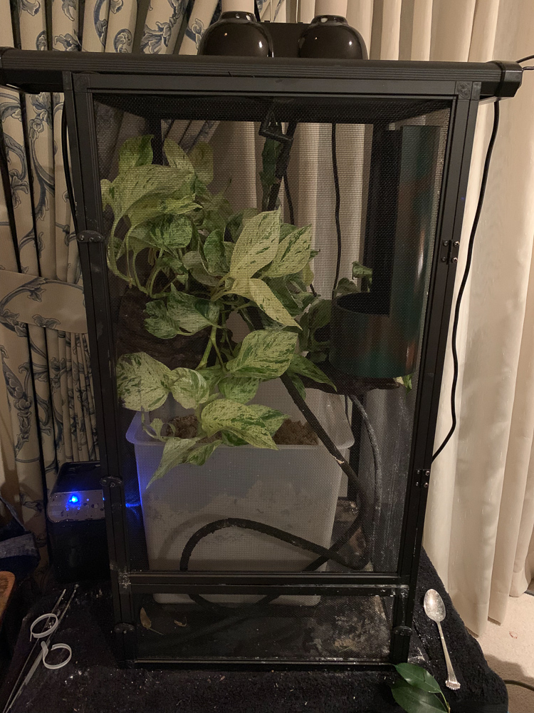 Awesome, thank you so much for all the help! Here it is with the bin, unfortunately though I had to take out her potted ficus and schefflera because there isn't enough room in there. I'm afraid she doesn't have enough foliage, but she has 2 snow white pothos on either side in magnetic planters. I'm working on getting a massive cage upgrade for her into a dragon strand, but this is what I have to work with right now! I also had to undo the vines from where they were in order to get the bin in there, so that is why they are hanging for right now. Feedback is appreciated :)