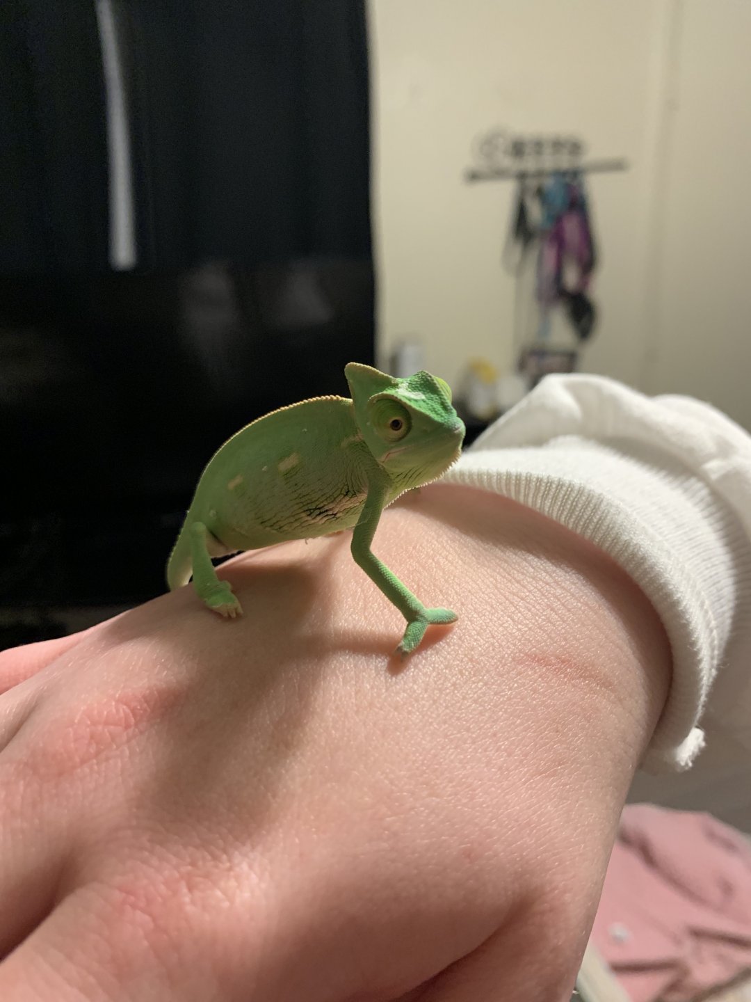 Your chameleon: my Chameleon is a baby veiled chameleon named Cammo. I’m unsure if it’s male or female my eyes play tricks but I think I see the bulge and the baby spurs but could be totally wrong. I’ve included pictures below so if someone could please help identify that would be amazing! He has been in my care for 4 days!! ♥️