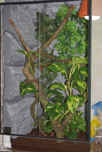 i have vines running horizontal between the branches, he cant reach the light and even when he gets bigger he wont b able to reach it, this tank is a lot bigger than it appears! lol. i know that many people say substrate is a bad idea but i got this from a reputable dealer here in germany and they assure me that what i am using is fine as they use it themselves too. i guess some people are over catious, i personally think that in the wild, there is soil on the ground so why would it be any different in his tank?