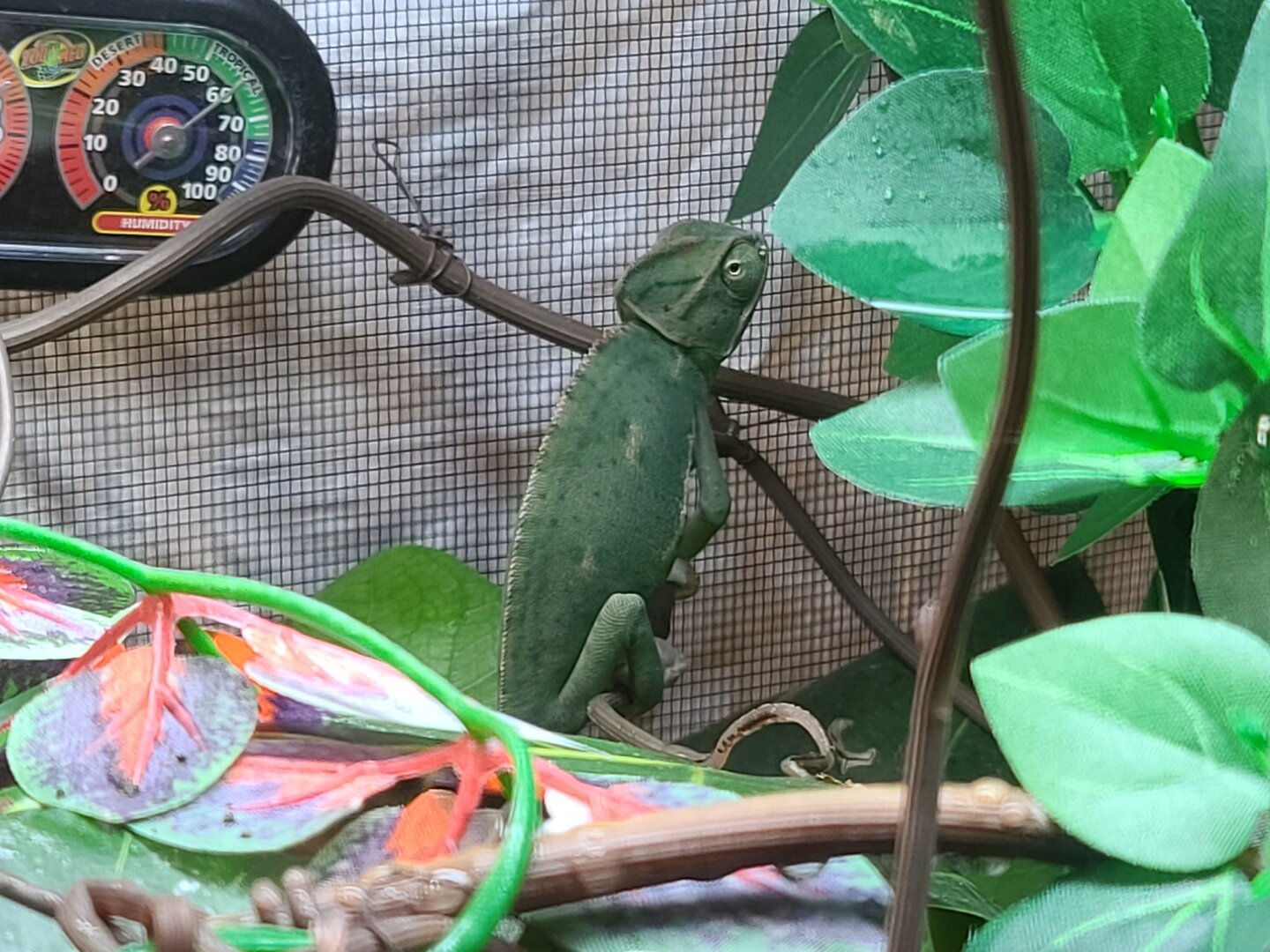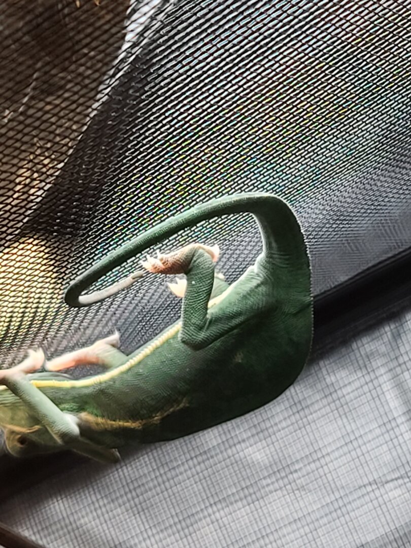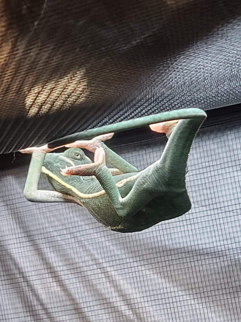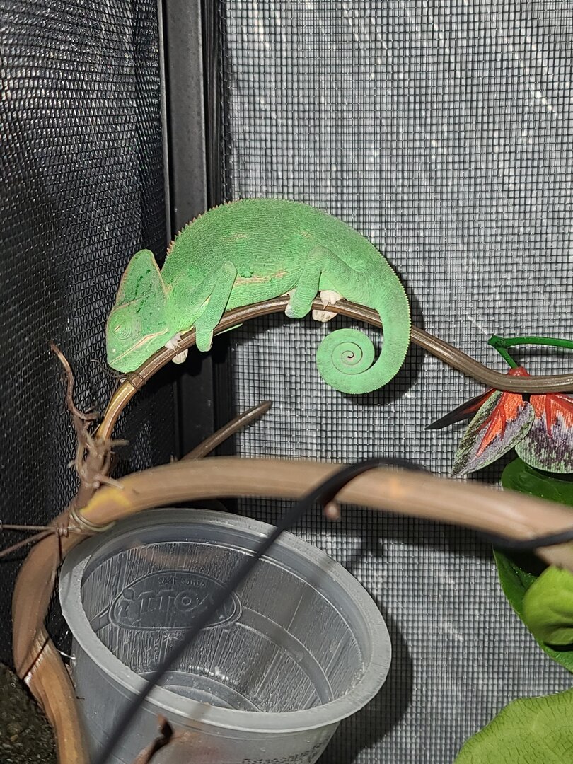 • Your Chameleon - The species, sex, and age of your chameleon. How long has it been in your care? Gus is a piebald veiled chameleon who I think is around 3 to 4 months old. Pet store said she was about 2 months old when I bought her 3 to 4 weeks ago. After reading here I think Gus is a female but I am not 100% sure. It is hard to get a good picture of her back feet as she hates the camera.