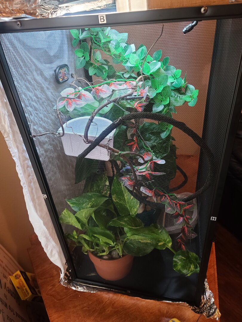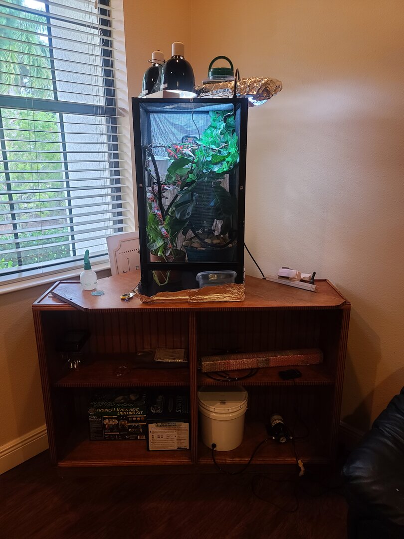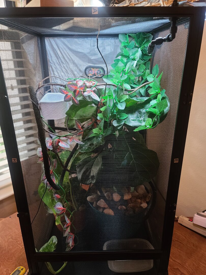 • Cage Type - Describe your cage (Glass, Screen, Combo?) What are the dimensions? I bought the cham kit because I didn’t know any better so Gus is in a 16x 16 x 30 reptibreeze screen cage. I guess it works for now. I have a 24 x 24 x 48 reptibreeze XL cage being delivered this week so I can plan and start building out her cage when she outgrows this one in a few months. This enclosure should also accommodate a lay bin too.