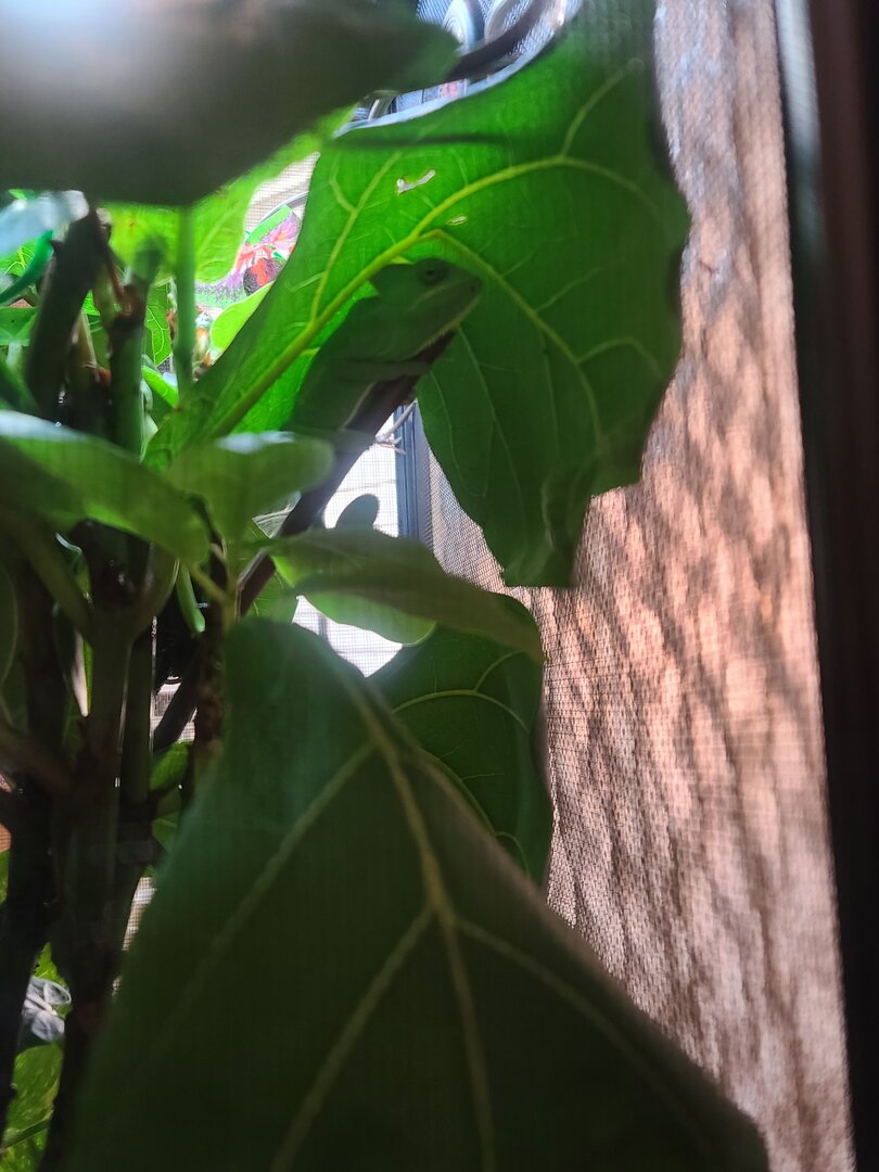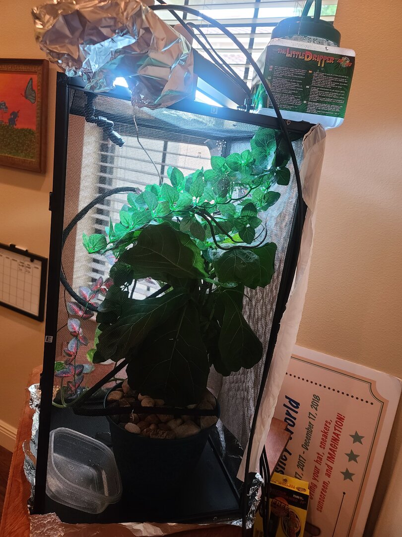 • Plants - Are you using live plants? If so, what kind? My live plants are limited by space right now but they consist of a small pathos and a larger fiddleleaf fig (ficus lyrata) that she likes to sleep in and chase crickets around on. I have the fake stick type vines for climbing and basking on and 2 small fake vine type plants. The fake plants are used for her dripper to drip down. I see her drink off it all the time but I will eventually remove them as she gets bigger over the concern of eating them.