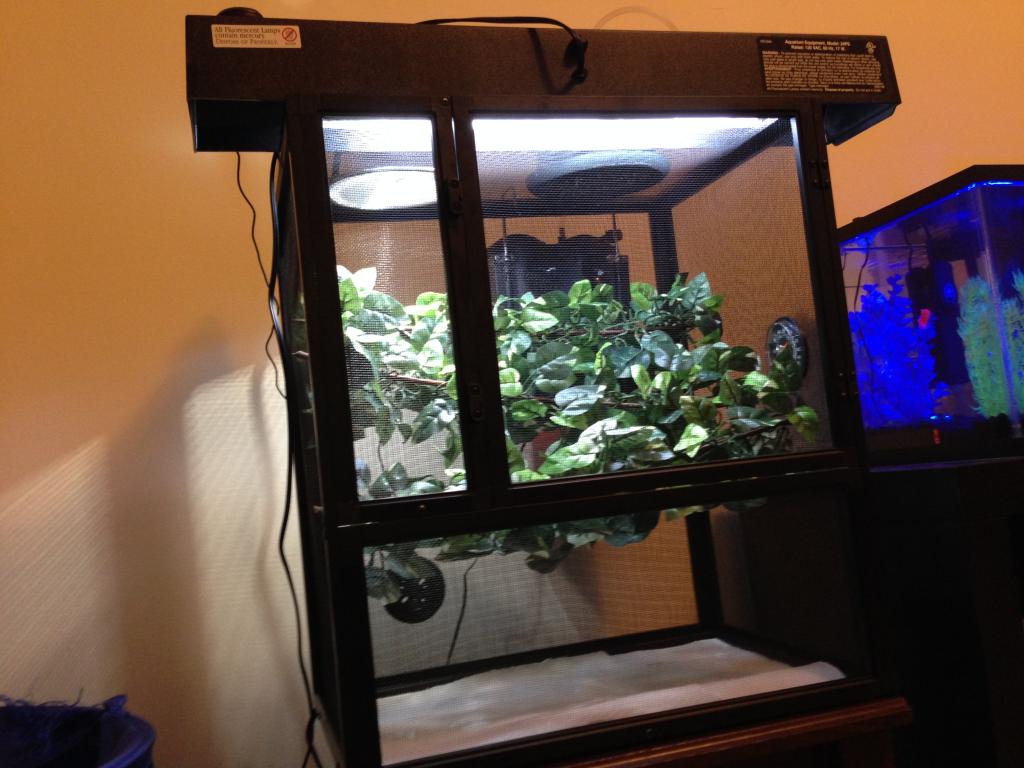His name is Jasper, and so far he seems to be doing great. He was understandably skittish when I unboxed him, but I let him climb out right into his enclosure and left him be. After an hour, I ran the mister/raindome I made and offered some crickets which he devoured very quickly