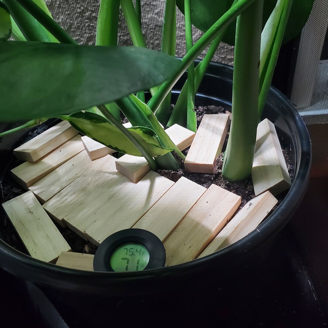 (Also I put Jenga blocks for now to keep him and any escaped feeders out of the soil. Will be changing that to flat river rock in the next couple days)