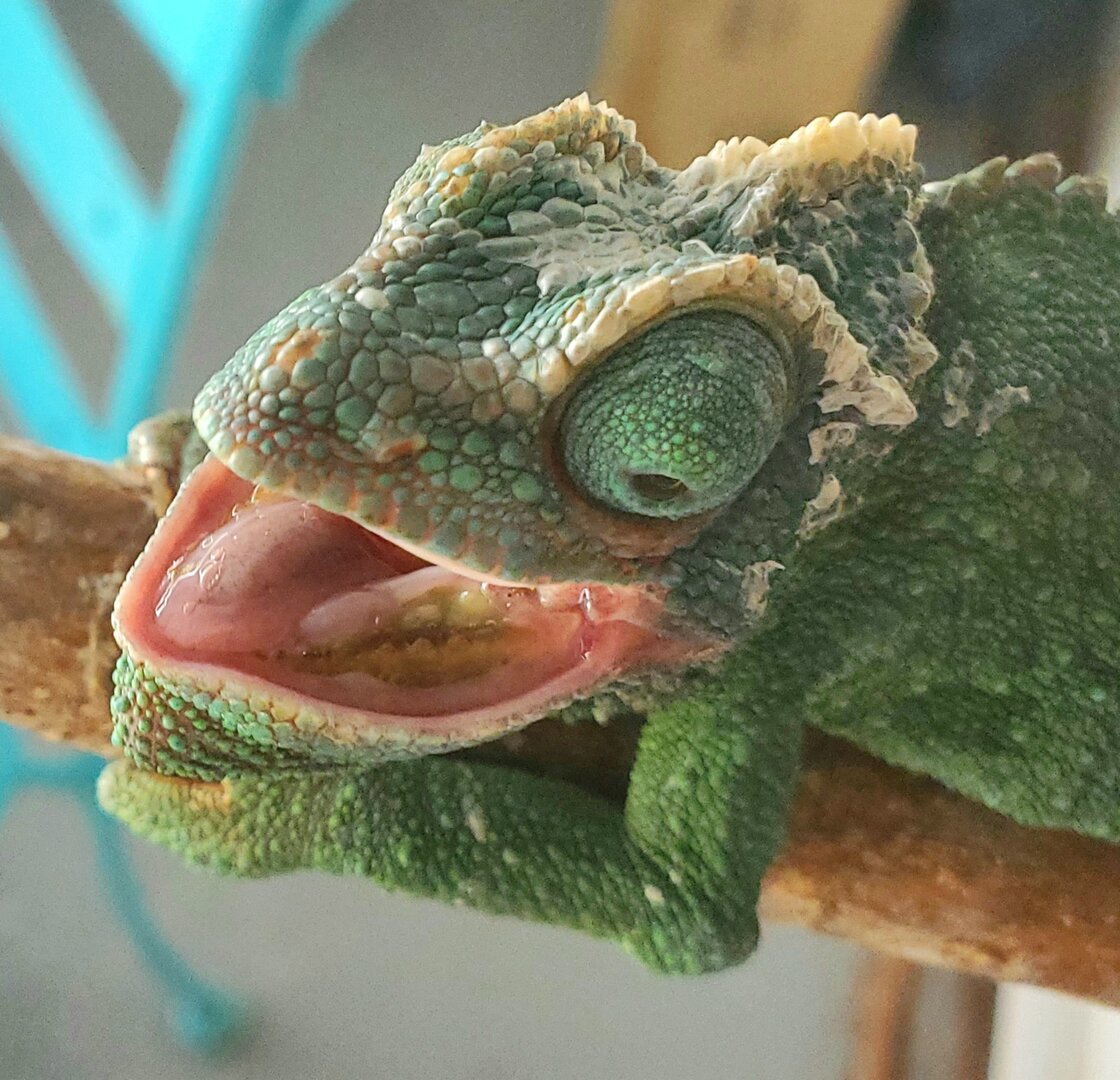 - **History** - She is a retired research subject (not mine). She was wild caught as an adult (Jackson's are invasive in Hawai'i; this was legal/permitted for research purposes). I'm not sure how long they had her or what her habitat conditions were. I adopted her and three other chams (adopted out to others) so they wouldn't be euthanized. She is missing most of her tongue. She tries to strike but it is very short. For most of the time I've had her, I have put crickets in a small bowl and she has been able to climb nearby and chomp on them. Recently, I noticed she wasn't eating them within a day so I observed feeding a few times and she's struggling now to catch the crickets. Even when I try to tong feed her, she tries to strike or chomp fairly far away from the crickets. I've had to handle her a bit more recently so I can place crickets on her tongue when she tries to strike. We've gotten better at doing this without handling/using tongs! But it's still hit or miss...literally. Have also been handling a bit so I can inspect her mouth.