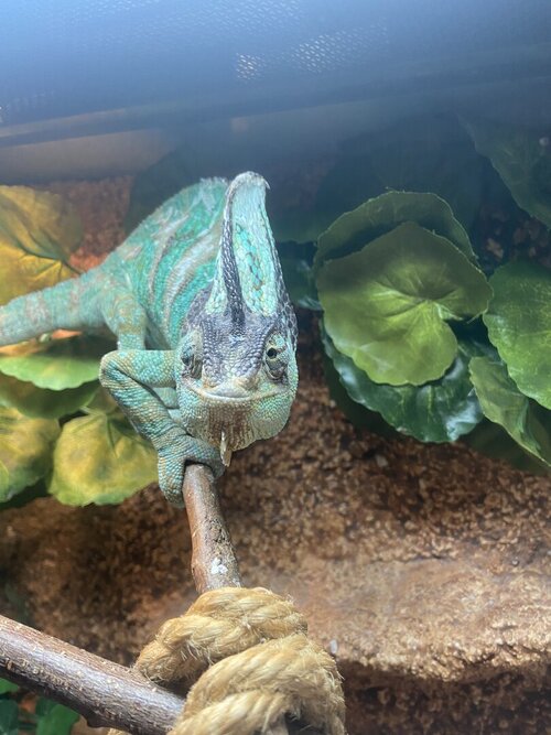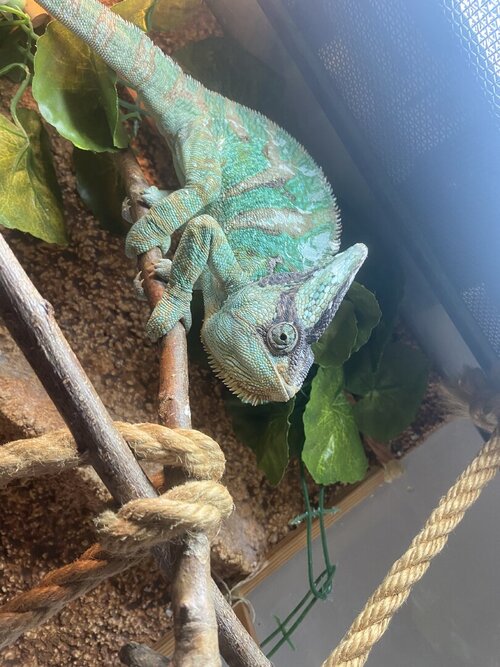 Hi everyone! First of all, sorry for my English. I live in Hungary and only speak a little English. I have a 3.5-year-old veiled chameleon. One month ago, I noticed that he wasn't shooting his tongue at his food. I took him to the vet, and they did a blood test. They said his phosphorus was slightly high and his calcium was low. But we caught it in time... We got phosphorus-restraining fluid and liquid calcium. These ran out and his condition started to deteriorate. He developed lockjaw and spasms. I took him to another vet, and they wanted to euthanize him because they said he had Zenker's necrosis. I didn't allow it, brought him home, and now I'm trying to treat him at home. Externally, he looks beautiful, is interested in his environment, and has a strong grip. Please help!
