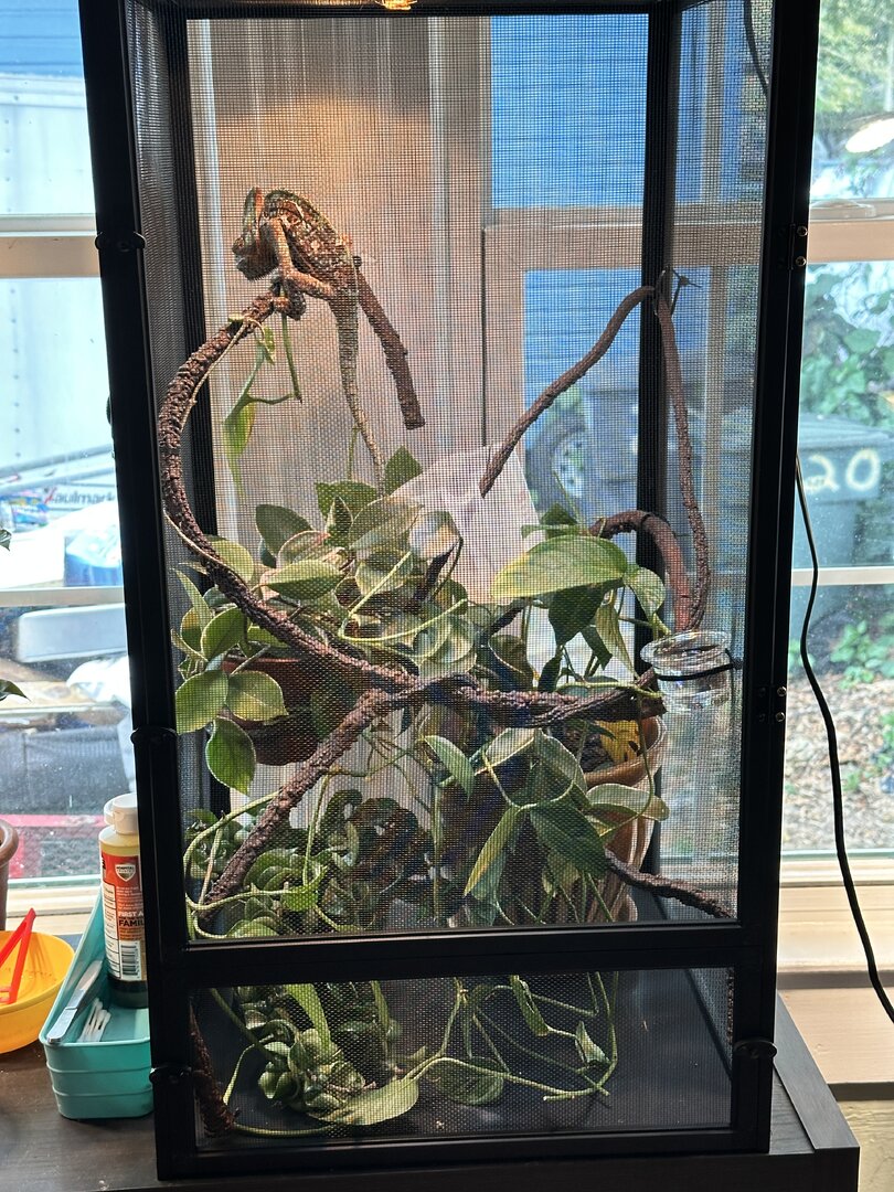 picture of him from when i saw him a couple days ago. i have him with me in a medium reptibreeze, arcadia 14% linear, and 60w incandescent bulb. my brother said hes fallen twice in his big cage so i downgraded him.