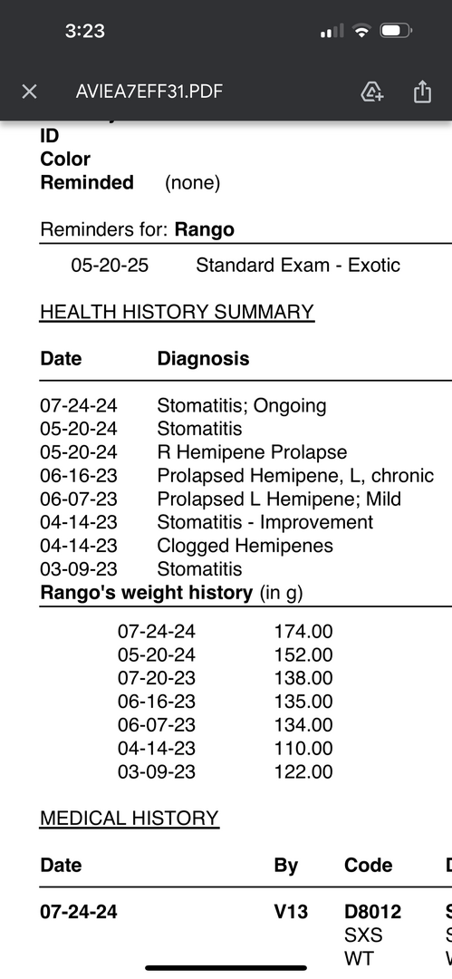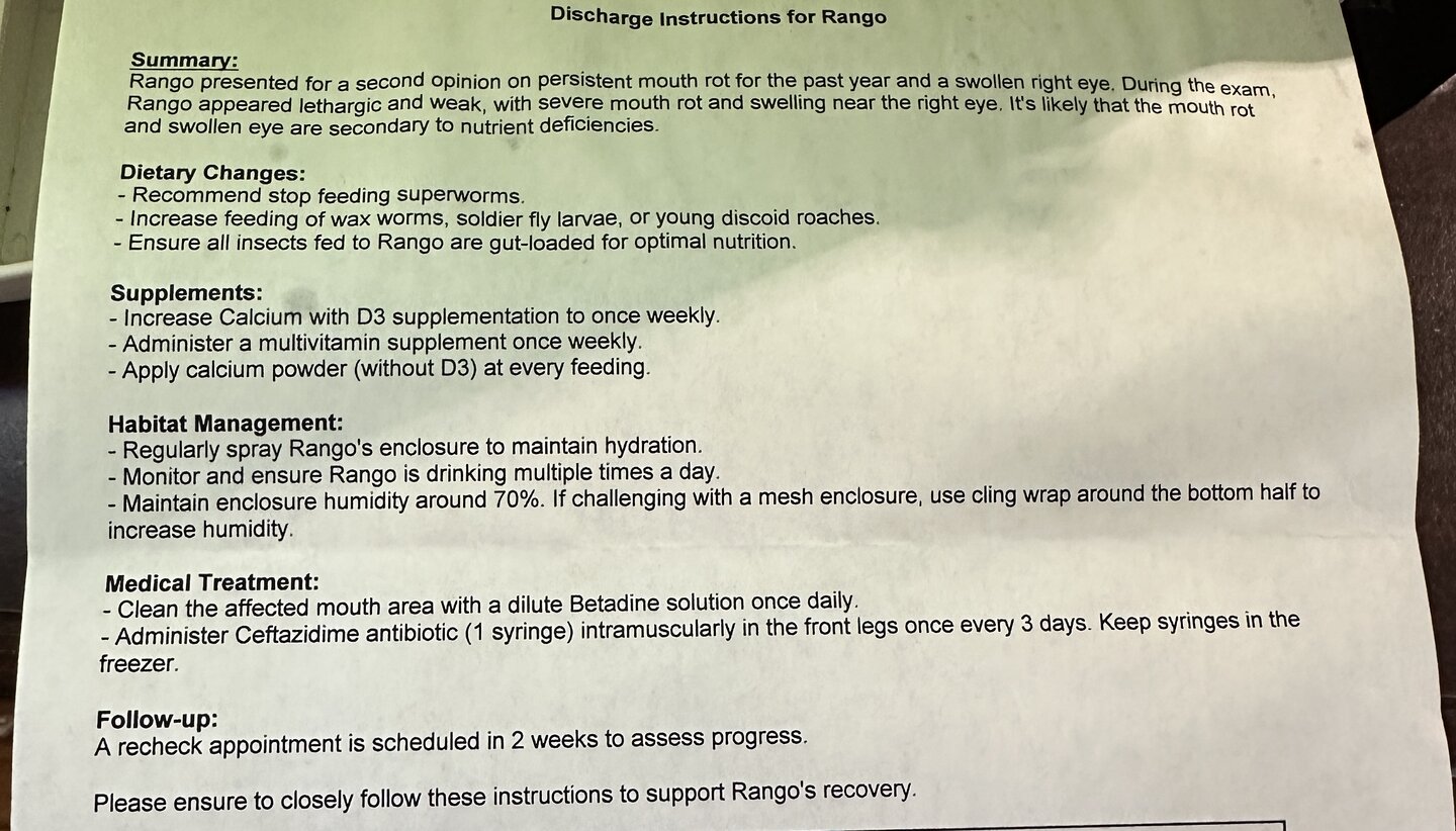 hi! havent posted here before but need a lot of second opinions. recently had to take in my brothers chameleon and i didnt know he wasnt doing well. this past year, hes had multiple visits for two problems, stomatitis/mouth rot and a hemipenes issue. he had his hemipenes amputated. a couple days ago i finally saw him and was shocked how hes still with us. took him to the vet and they gave us antibiotics, pain killer and betadine. its the same thing the first vet was doing but maybe my brother didnt keep up with the care? and thats why it looks so terrible? at this point, he barely opens his mouth, he doesnt accept food by himself, and i havent seen a poop in 3 days. am i at the point of deciding if living is too stressful for him? i know he still has some life but if his whole lip has rotted away, what am i doing