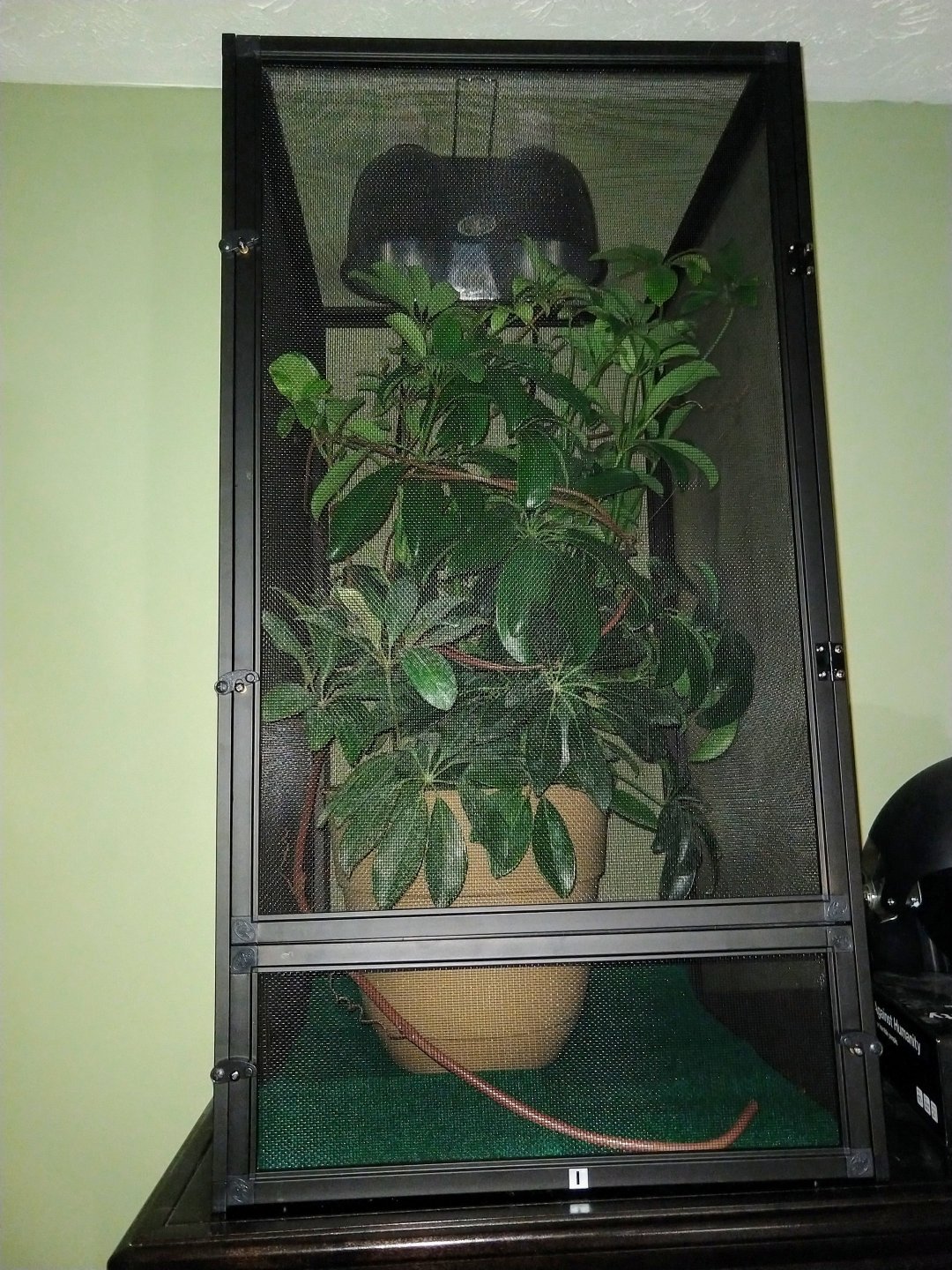 I don't have any recent pics and I'm at work now but the only differences between this and now are a) the plant lost half it's branches a couple months ago but it's slowly regrowing (I plan on getting a grow light to help with that) b) I've removed the carpet, and c) there's a second, much sturdier branch in it now.