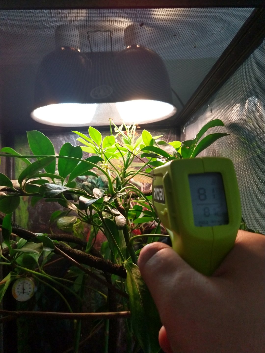 • Humidity - 80% spikes during misting to 50% in between mistings.