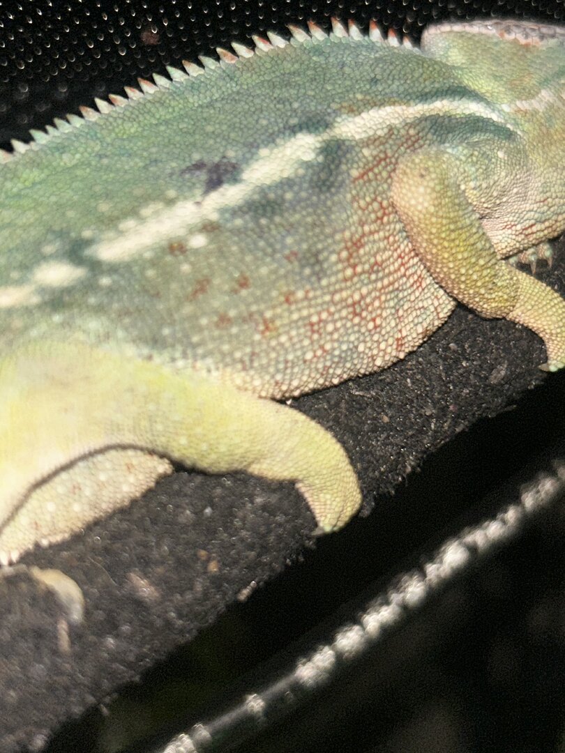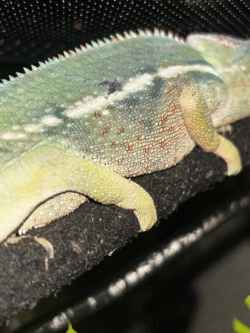 So my juvenile male panther reached for his vine nd he kind of missed it nd fell it wasn’t a huge fall but i was still concerned since im a new chameleon owner.. he felled clipped the side of his terrarium tank now he has a small dark spot on side of his body… should I be concerned??? He is acting like he normally does nothing out of the ordinary after it happened… can anyone help..