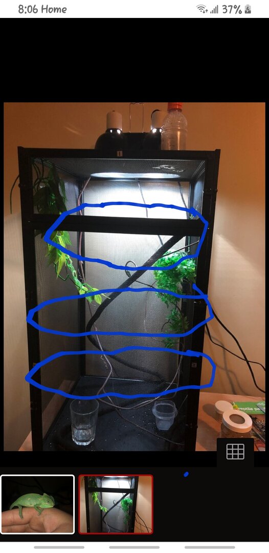 You will need a lot more vines and branches. Like 20 more. Ditch the fake plants and get some real plants for him to drink the water off of, the plastic is not good to drink off of.Hello, the temps are around 80F her cage is a repti breeze, I bought the Chameleon kit and I have basic lights set up. I have extra vines and added leaves for her to climb on.