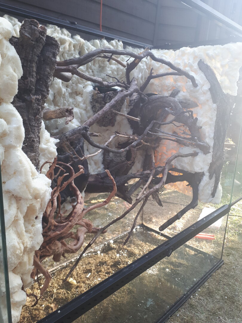 The terrarium itself is a 36x18x36 ExoTerra glass terrarium with the new paludarium base (more space between the bottom and lower vent strip), and I've been using Great Stuff Big Gap Filler with the no drip dispenser. In total, I've used ~8 cans for this build.
