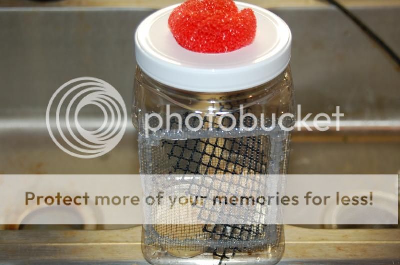 I finally came up with this lil project and I thought I would share. The goal is that the Pupae can hatch, feed, adn grow a bit in this containers. When they are ready to feed off, I simply place the pod into the cage at the bottom and remove the sponge closing up the top.