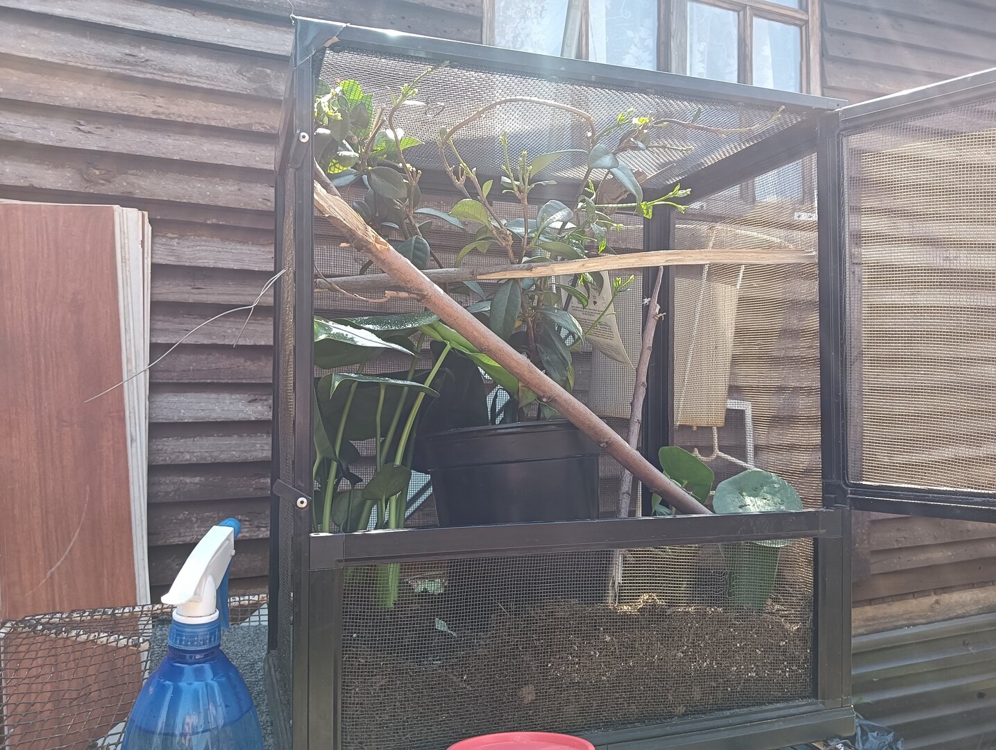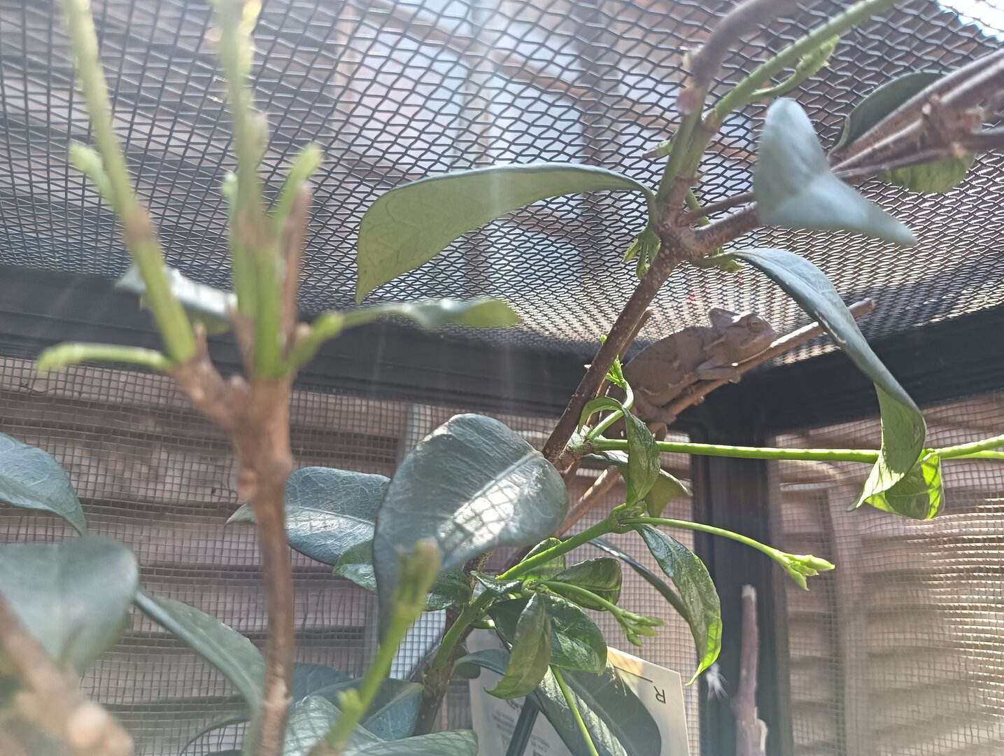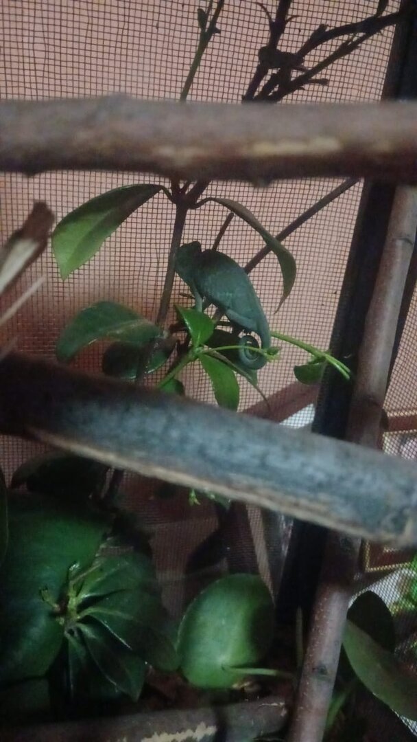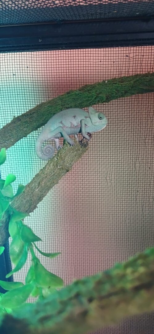 Good day so sorry to bother my wife and I just got this baby 9 week old male vale chameleon and today I made some changes to his cage by going bio active by adding some better plants organic potting soil spring tales and isopods after a struggle and intruding him to the cage he got brown and dark as different colour then he uslay is I know after I water the plants he started gaping witch means his hot and went down to the floor of the cage he kept moving up and down to the floor and high up and he still was dark my temps are between 21c (69f) to 32c (89.6) from morning to late afternoon and humidity is now a constant 34- to 45 just want to find out if it was just stress being handled so much and in a new environment we feed him crickets with calsum powder without d3 and planted the plant in the middle into the soal