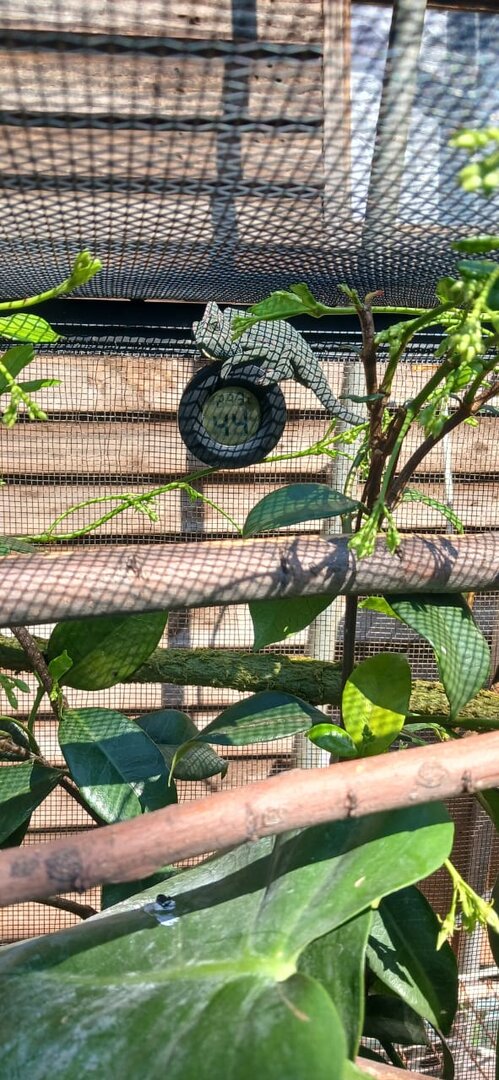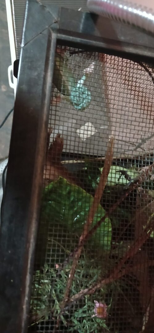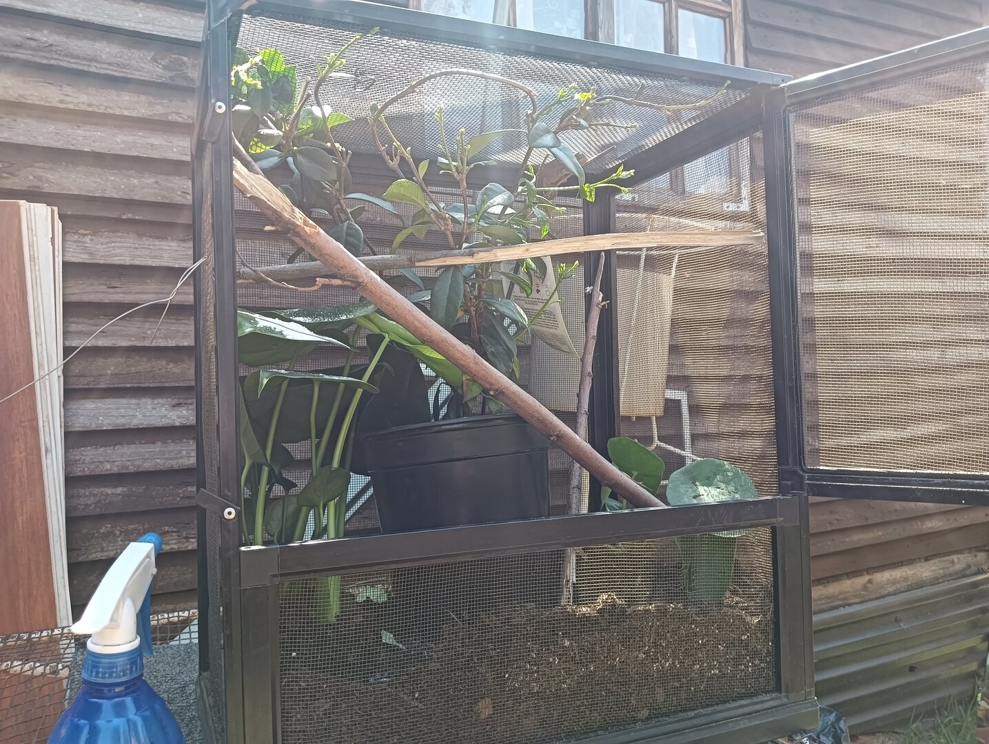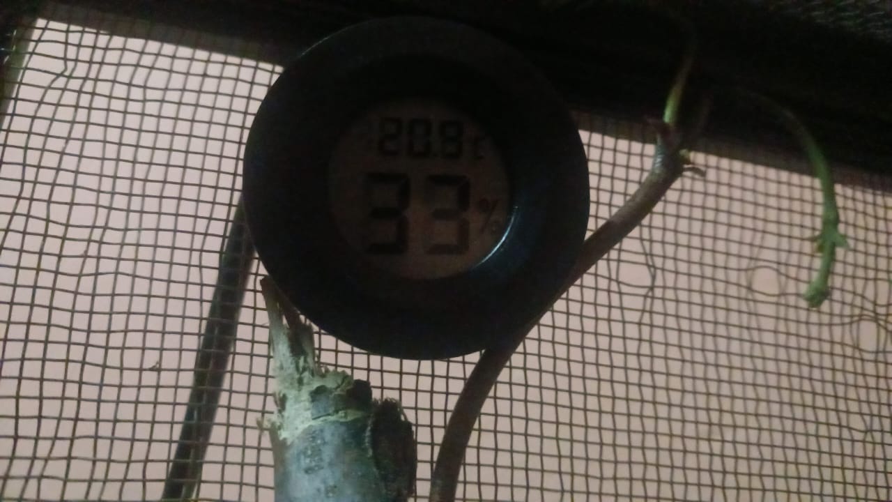 Good day so sorry to bother my wife and I just got this baby 9 week old male vale chameleon and today I made some changes to his cage by going bio active by adding some better plants organic potting soil spring tales and isopods after a struggle and intruding him to the cage he got brown and dark as different colour then he uslay is I know after I water the plants he started gaping witch means his hot and went down to the floor of the cage he kept moving up and down to the floor and high up and he still was dark my temps are between 21c (69f) to 32c (89.6) from morning to late afternoon and humidity is now a constant 34- to 45 just want to find out if it was just stress being handled so much and in a new environment we feed him crickets with calsum powder without d3 and planted the plant in the middle into the soal