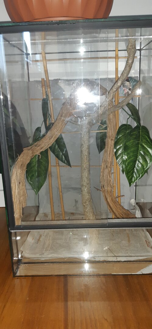 I wasnt prepared and so i used the bathtub as an enclousure with a bonsai and sticks. Unfortunatly the delivery man is not working and so i have tp wait till monday for fruit flies.You need tons of flightless fruit flies. Did you listen to the podcast link? Did you put them in their own enclosure with a plant? How do you have them set up. Take pics.