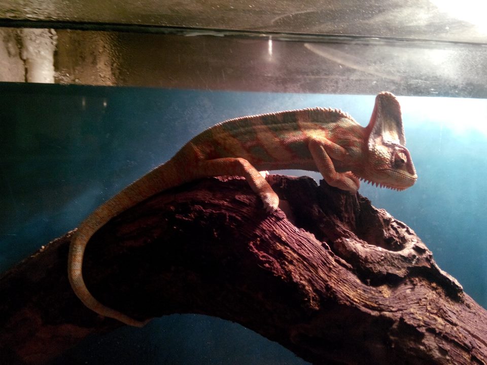 Hi everybody. I just got a new chameleon i have him for like 3 days. . He is in a glass aquarium i know that its bad, but the aquarium is big enough and its geting good ventilation. Ive put some logs ... i didnt bought them from a pet store i live in a village so i got the from the forest. He has some plants. Ive put a 75w lamp which should be enough and im turning the lamp on when i go to school at 7am and turn it off at 9 pm.