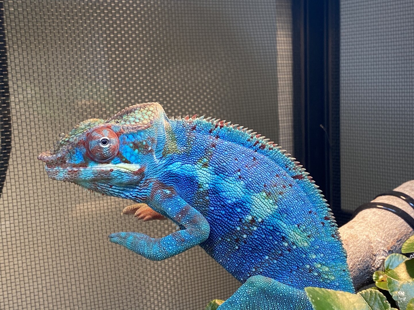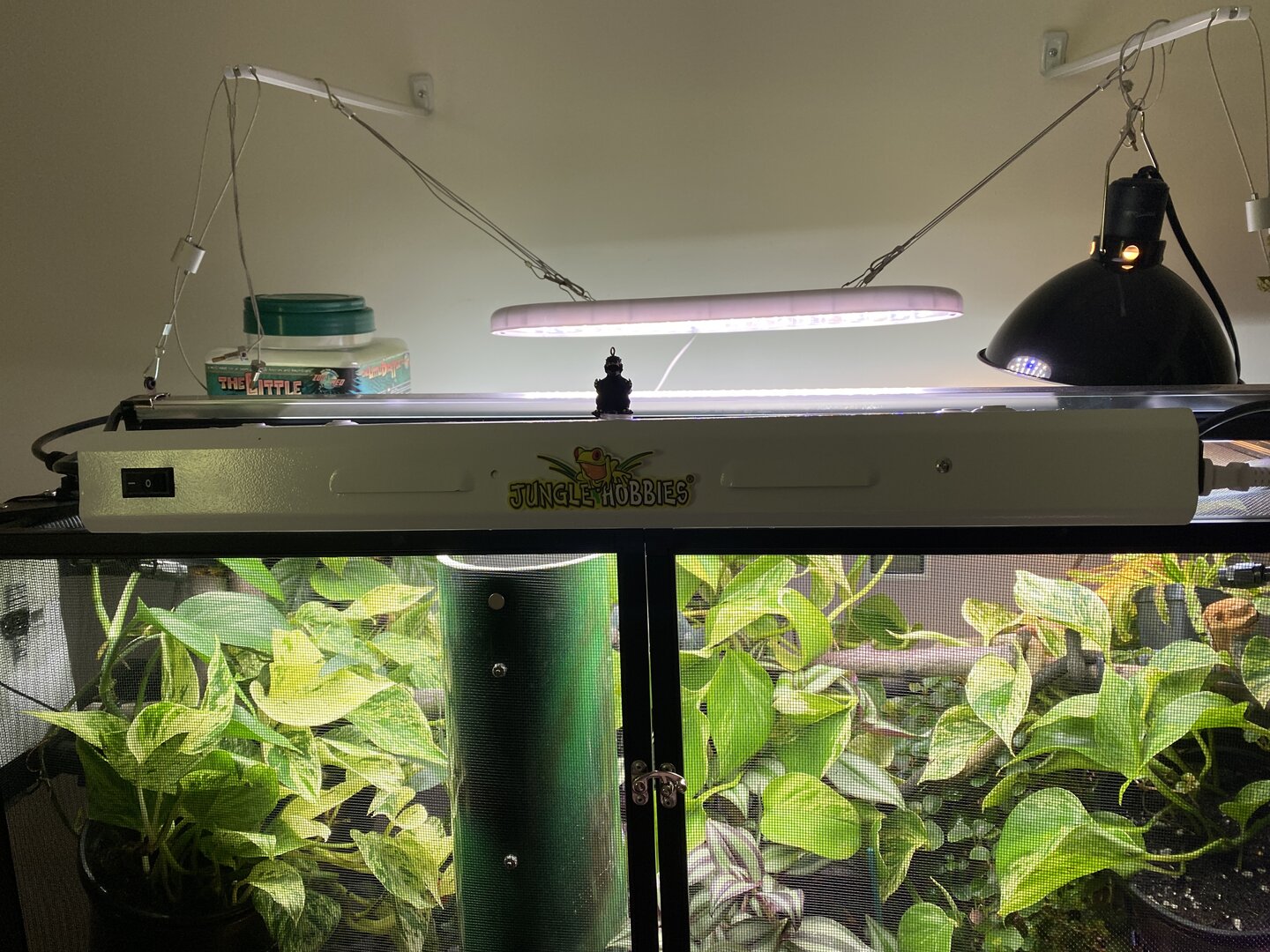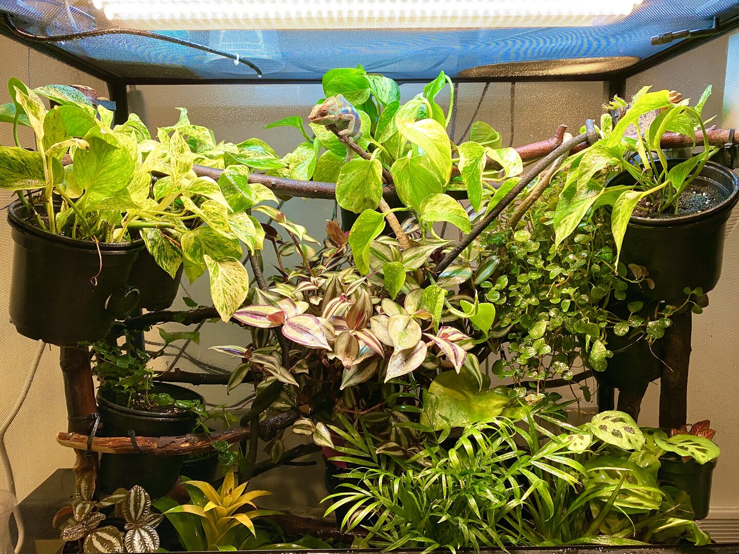 As for his cage set up, he is in an 18x18x36”wide cage. He has a 50WReptisun basking bulb in a wide reflective zoomed dome in one corner with a branch about 7-8 inches below. I use a thermal laser gun to check temps regularly and his basking spot is at about 87 degrees. Ambient temperature is about 75, with gradients at 65 or so at the middle and bottom of the cage. I use a 36” sun blaster UVB light fixture with a 34” Reptisun T5 HO UVB linear fluorescent bulb. I use a solarmeter to regularly check his UVB levels. He is at a UVI of 1.5-2.6 depending on the area (made pockets where he can get more or less) putting him on a 3 of the Ferguson chart. I have double fixture or 2 Vivosun 24” 6500k plant grow lights, 1 24” LED 3500k grow light, and two full spectrum LED grow lamps at the top and side of the enclosure mainly for his plants. We only use live plants. He also has a little dripper dripping at 1 drop p/s in the AM and then 1 drop every 4-5 seconds in the PM. He has a mistking with two spray heads placed and pointed at plants strategically to collect water for him to drink, and also achieve spikes of humidity up to 80% 2x per day. His mister goes on at 6am for 6 minutes, 10am for 10 minutes, 2pm for 10 minutes, and 4:45pm for 5 minutes. Lights are on for 12 hours a day and come on automatically at 5am and go off at 5pm. Once lights go off, he also has a dual exhausted fogger that goes off for about 15 minutes 3x at at dawn to increase humidity and recreate the fog in the wild. I use a dual fan to create some airflow at night for the enclosure and to help lower the temperature by 10-12 degrees (F) for thermal regulation.