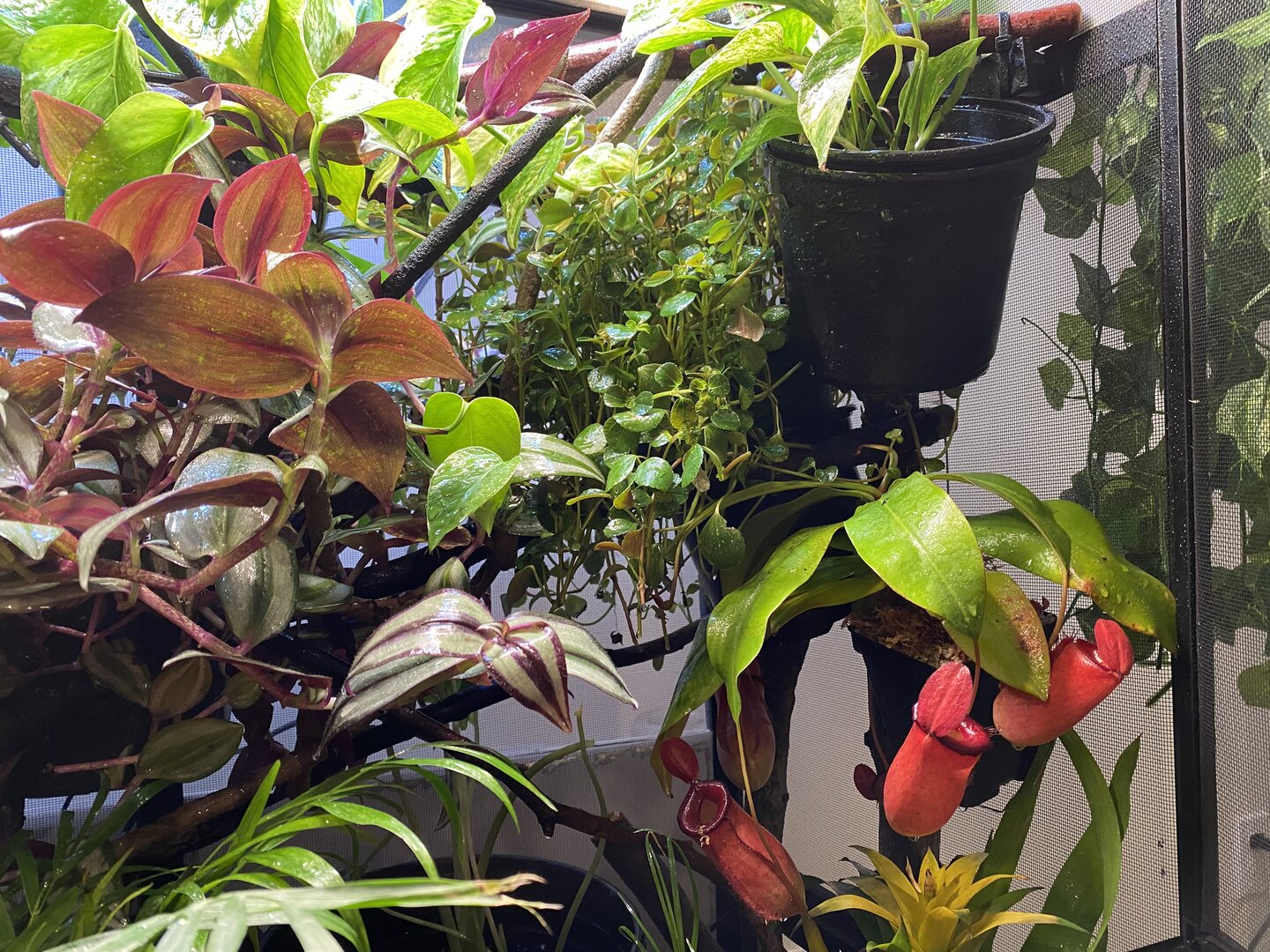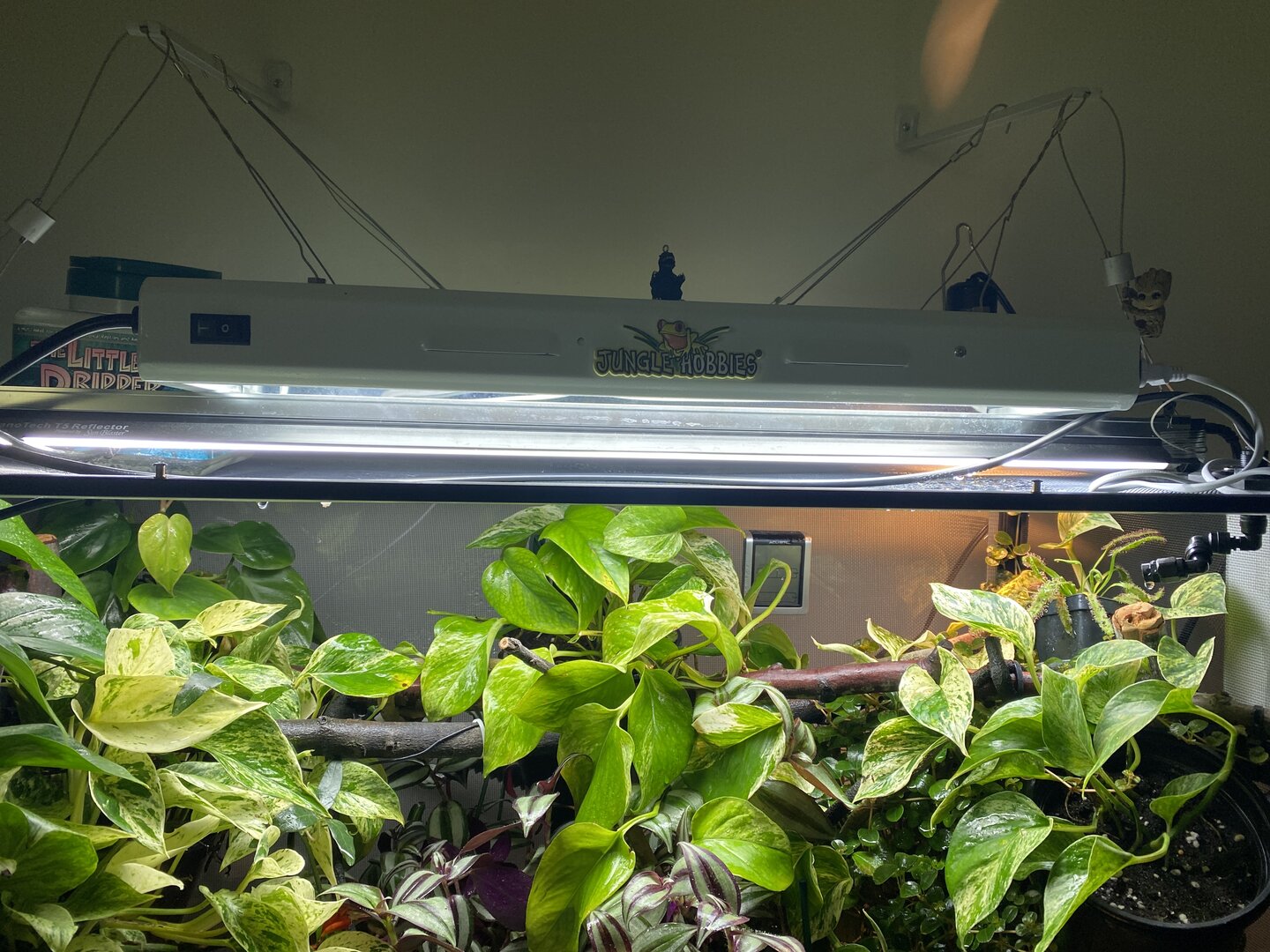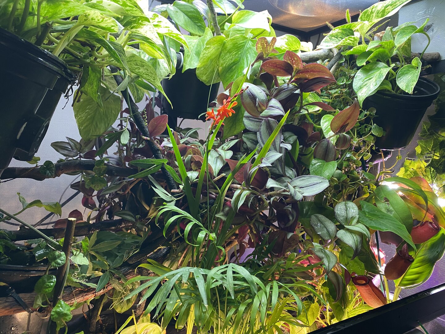As for his cage set up, he is in an 18x18x36”wide cage. He has a 50WReptisun basking bulb in a wide reflective zoomed dome in one corner with a branch about 7-8 inches below. I use a thermal laser gun to check temps regularly and his basking spot is at about 87 degrees. Ambient temperature is about 75, with gradients at 65 or so at the middle and bottom of the cage. I use a 36” sun blaster UVB light fixture with a 34” Reptisun T5 HO UVB linear fluorescent bulb. I use a solarmeter to regularly check his UVB levels. He is at a UVI of 1.5-2.6 depending on the area (made pockets where he can get more or less) putting him on a 3 of the Ferguson chart. I have double fixture or 2 Vivosun 24” 6500k plant grow lights, 1 24” LED 3500k grow light, and two full spectrum LED grow lamps at the top and side of the enclosure mainly for his plants. We only use live plants. He also has a little dripper dripping at 1 drop p/s in the AM and then 1 drop every 4-5 seconds in the PM. He has a mistking with two spray heads placed and pointed at plants strategically to collect water for him to drink, and also achieve spikes of humidity up to 80% 2x per day. His mister goes on at 6am for 6 minutes, 10am for 10 minutes, 2pm for 10 minutes, and 4:45pm for 5 minutes. Lights are on for 12 hours a day and come on automatically at 5am and go off at 5pm. Once lights go off, he also has a dual exhausted fogger that goes off for about 15 minutes 3x at at dawn to increase humidity and recreate the fog in the wild. I use a dual fan to create some airflow at night for the enclosure and to help lower the temperature by 10-12 degrees (F) for thermal regulation.
