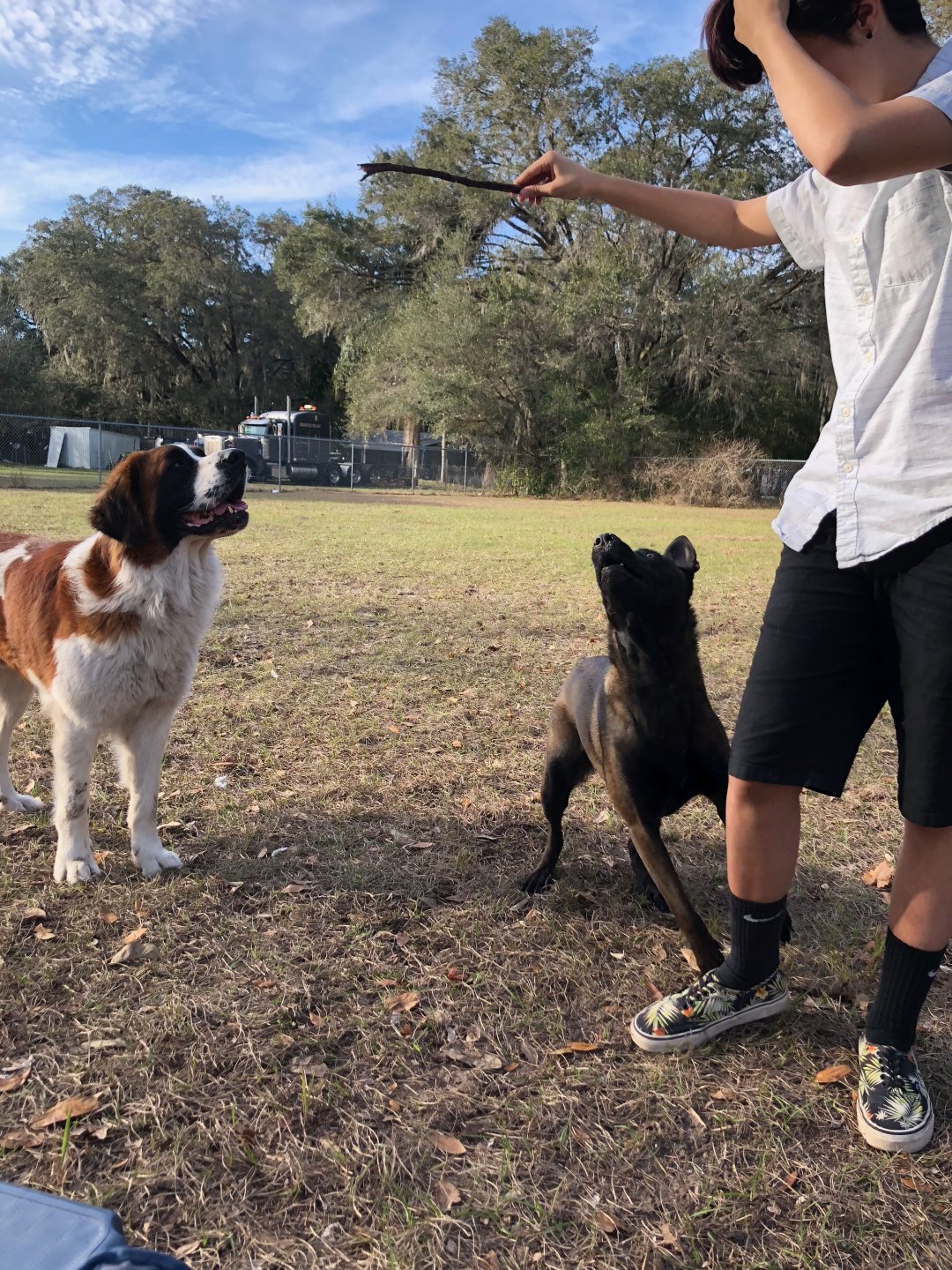 In the first one which is the one of me holding the stick up that is petra our female, and next to her is our saint bernard canon! Then the third picture is our male Norbit, like the movie if you have seen it LOL