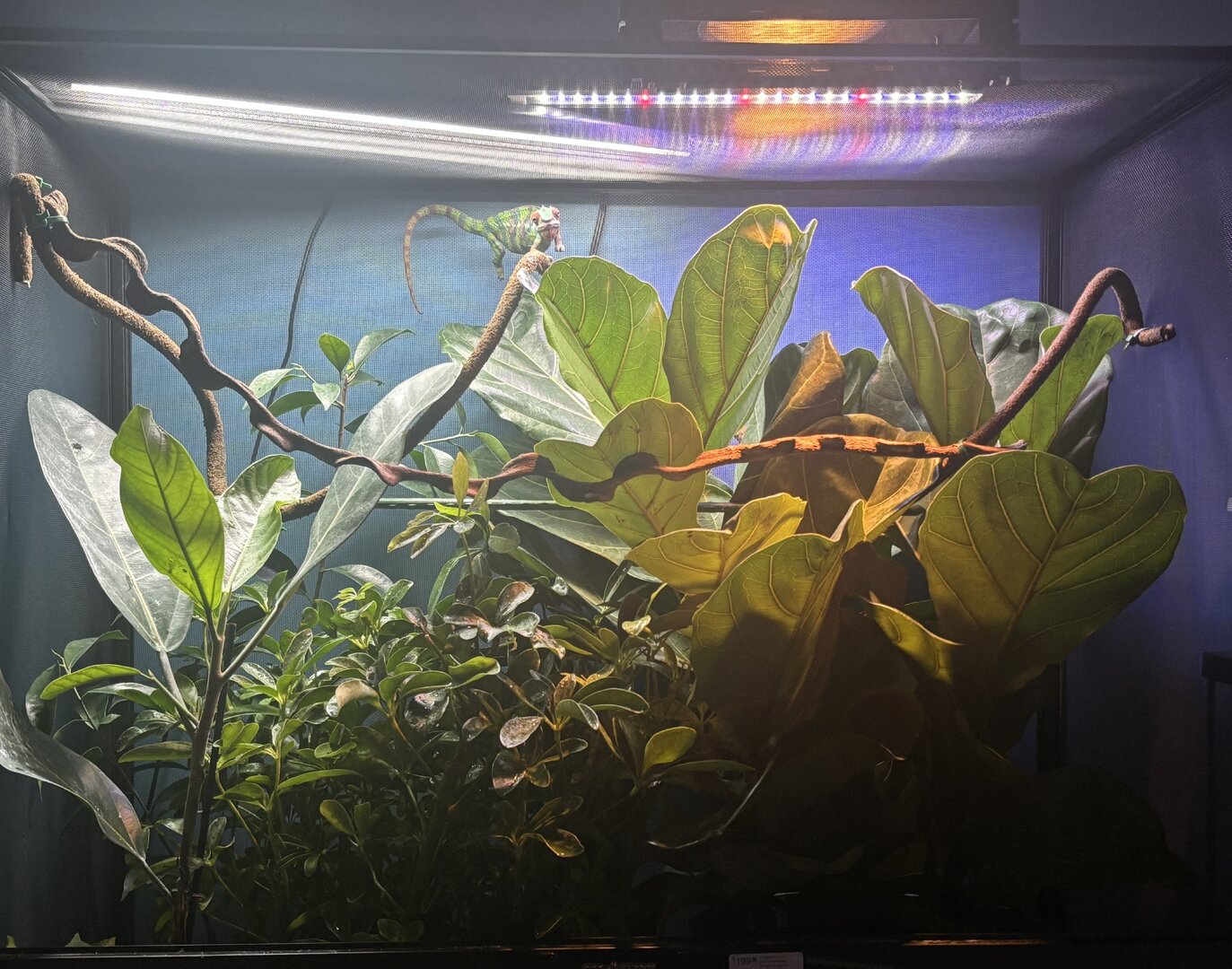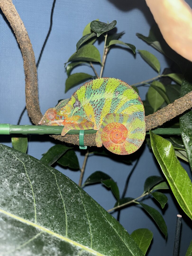 I wanted to share my panthers enclosure. He is in an exoterra screen enclosure that is 36x18x36. He currently has a fiddle leaf fig tree, a umbrella plant, a rubber fig, a Chinese banyan and a recently added (not included in this pic) golden Pothos that I hung by the two branches to the far left that I’m hoping will grow out and wrap around those. His lighting includes aT5 5.0 uvb. A full spectrum led for plant growth and a 60w Arcadia halogen bulb for basking. I also added another stick for him to climb in the back left corner recently that is also not included in this photo. I wanted some feedback on if what I have is any good. I’ve heard mixed opinions on the fiddle leaf figs. Currently at bed time he loved to hang out in the umbrella plant or climbed to the lower part of the Chinese banyan. I’ll also include a photo of him in his pajamas