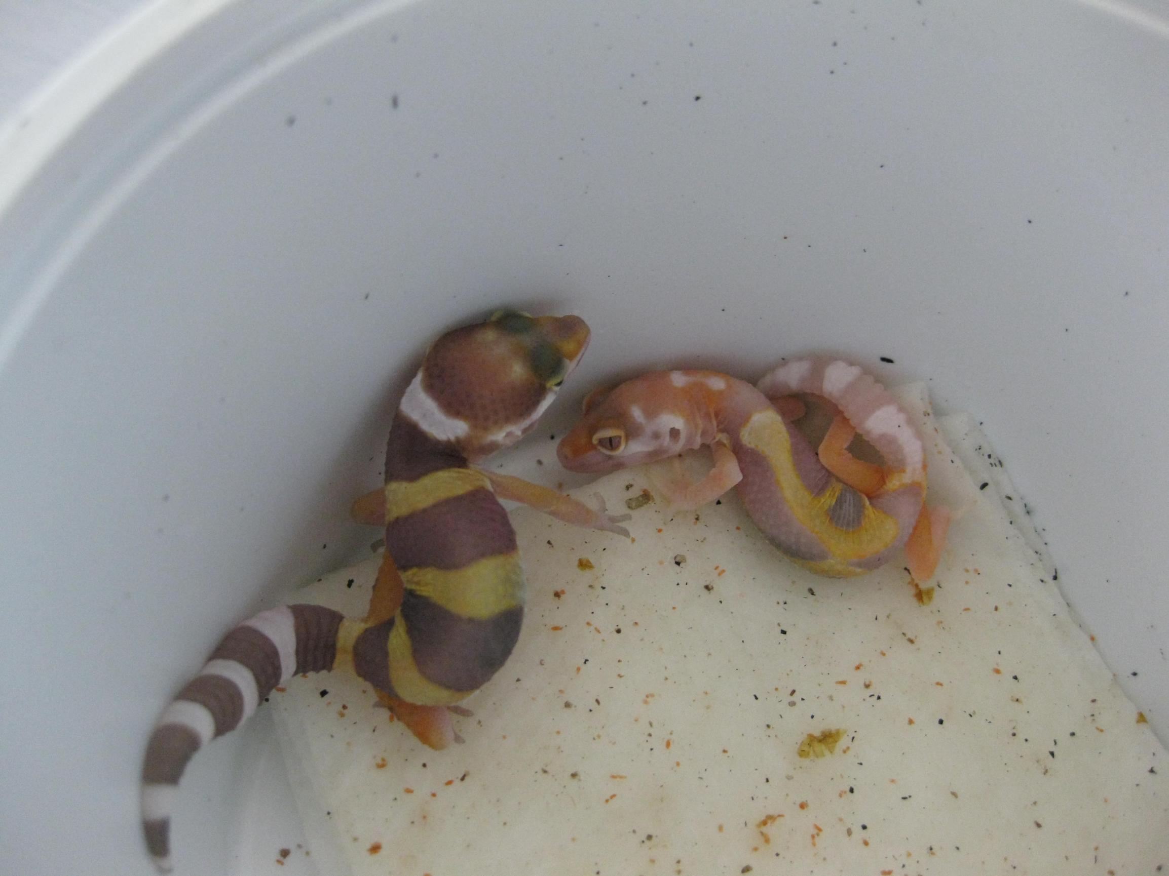 Wow man looking good the baby with red eyes could be a Bell albino, some kinda jungal raptor, radar, typhoon it is hard to tell with out knowing the mom and dads back ground. the other looks like a normal or mybe a tremper albino nice pairing it looks like both the mom and dad have het bell or het tremper in there blood thats why you got two different babies.