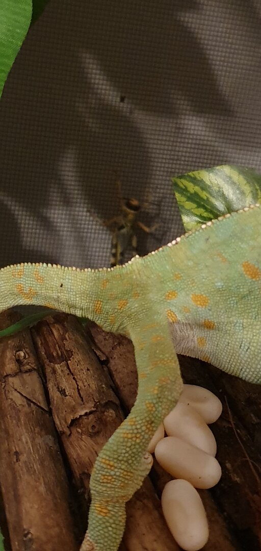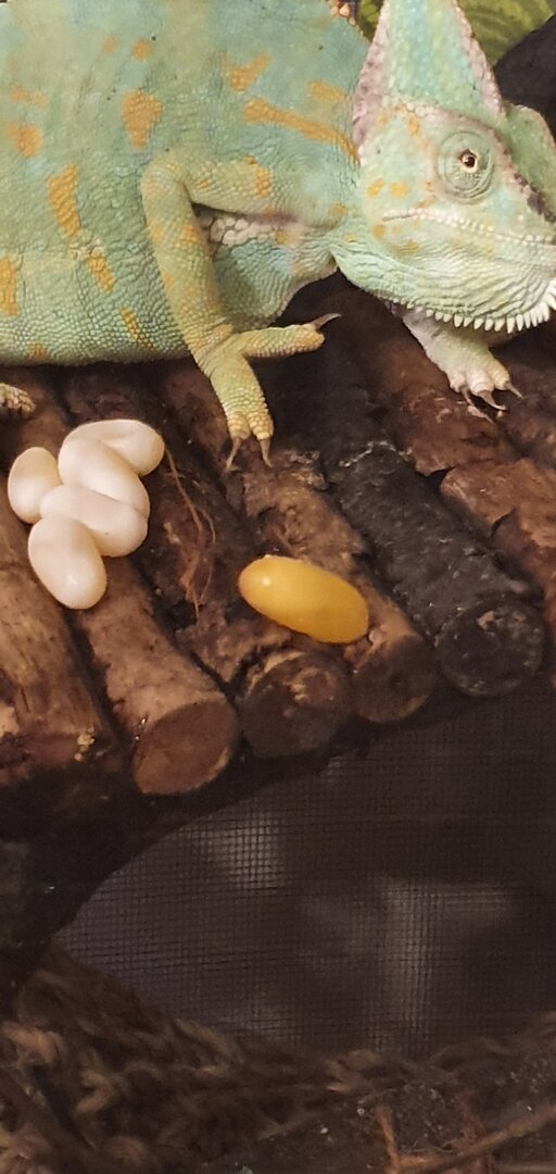 MY MALE CHAMELEON HAS WEIRD EGG LOOKING THINGS IN HIS CAGE
