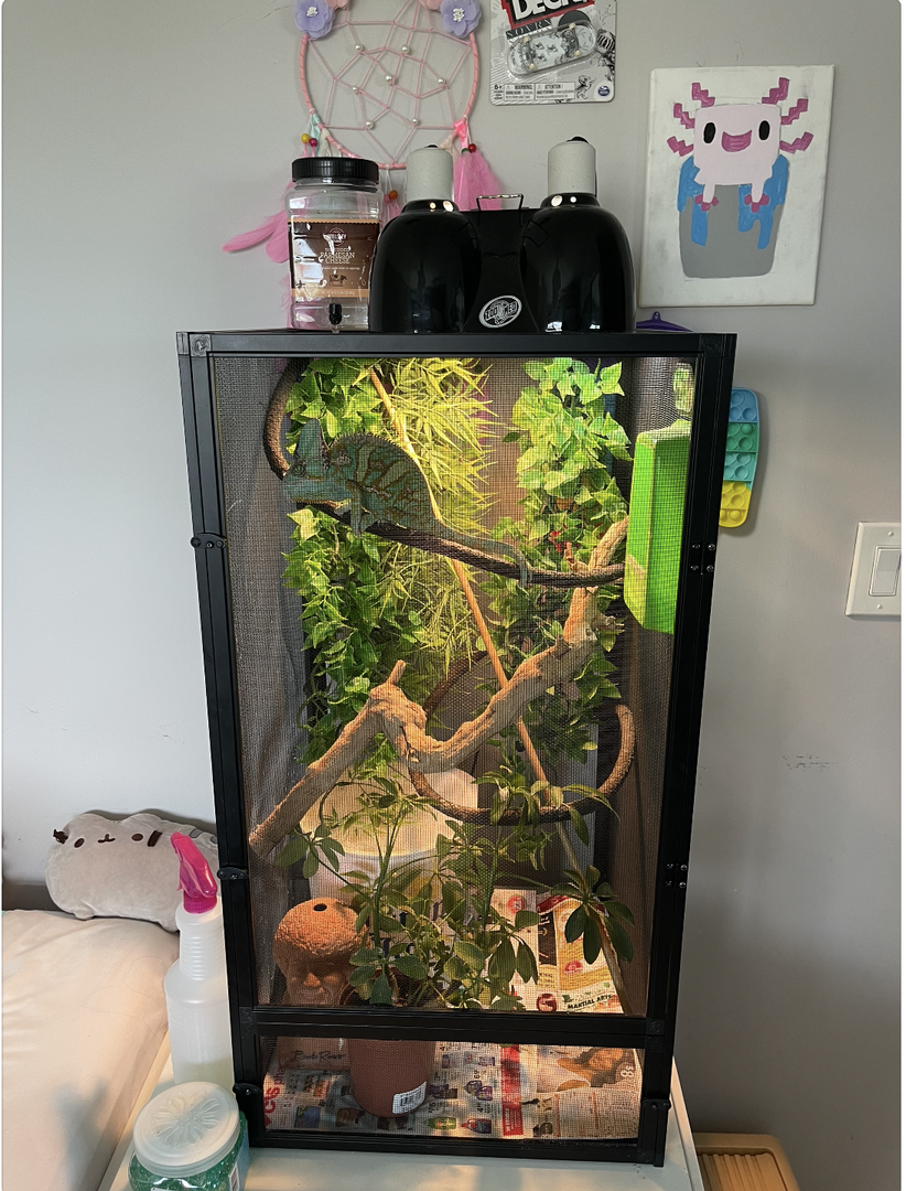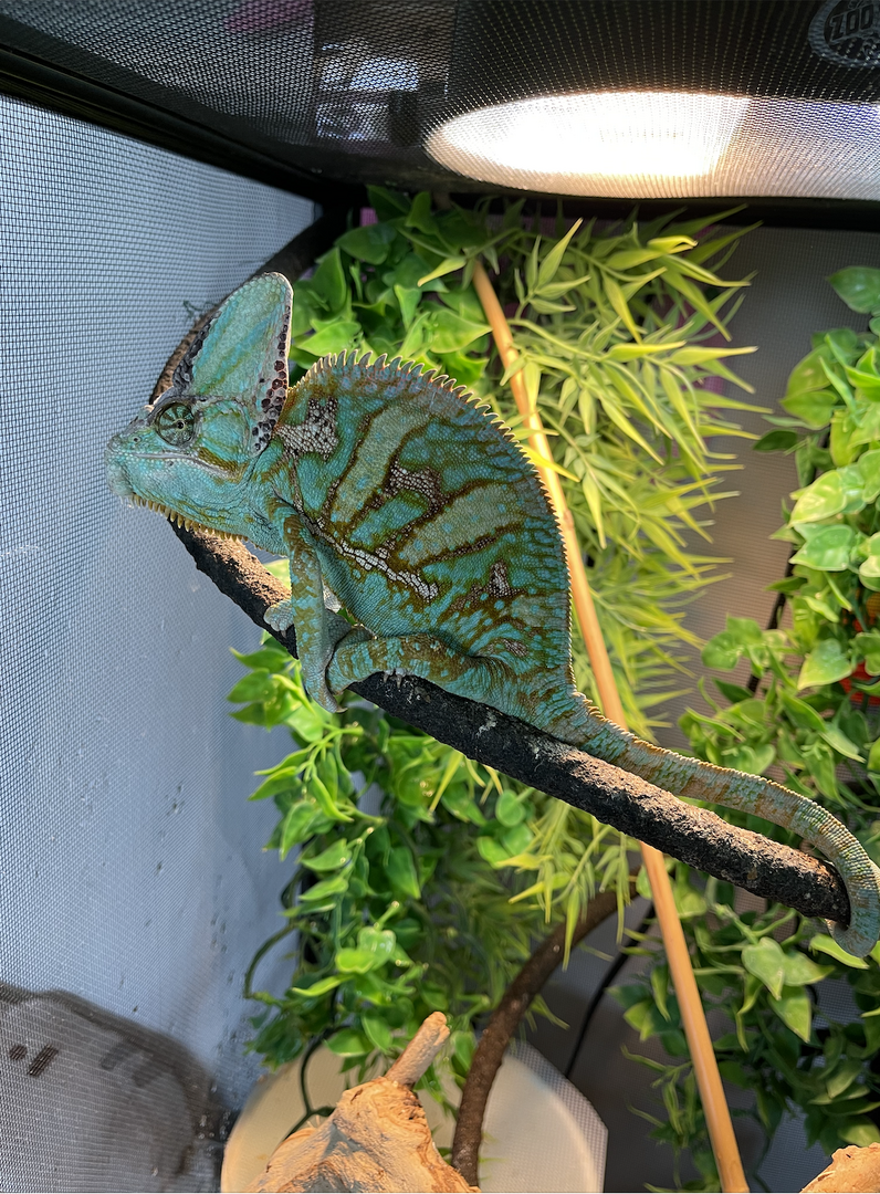 Hello everyone, I just joined this website today but I've previously clicked on this website before to learn more about chameleons. I am making a post right now because my male-veiled chameleon started to randomly shoot his tongue out aiming it at one of his branches. An hour ago I saw him fully shoot his tongue out at a branch and I was very confused since there isn't any bugs on it and ever since I've owned him (I've had him for a year ad a half) I have never seen him fully shoot out his tongue. When he does aim for an insect he doesn't even shoot his tongue out halfway. When I saw him fully shoot out his tongue it sort of looked like he was throwing up. Before he shot his tongue out he wasn't looking at the object he wanted to aim for. I think he might either be suffering from maybe some sort of bacteria or even some type of cleaning product that accidentally went into his cage or maybe he has a piece of super worm stuck in the back of his throat and he can't get it out, therefore, making him fully shoot out his tongue. I turned off both his bulbs because maybe the heat is getting to him and to see if maybe this would stop. Someone, please help my baby I don't want him to die. I also have a video of him doing it but i have no clue how to post the video with this post so ill post it seperately. Also he just started foaming from his mouth.
