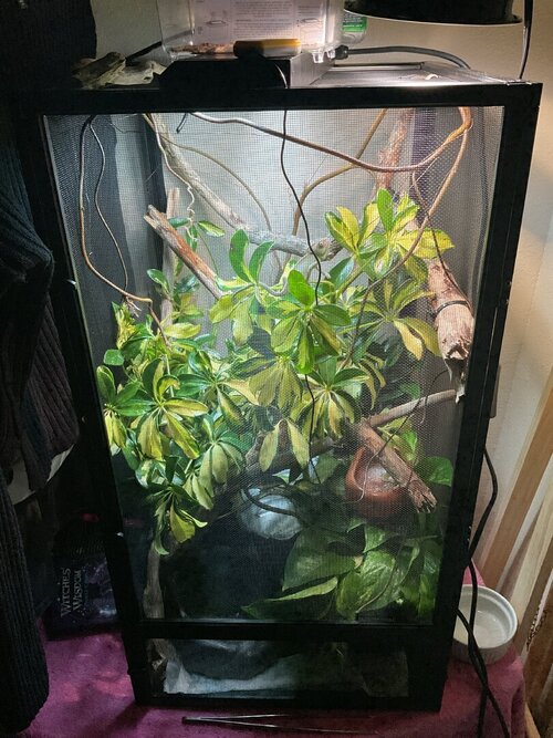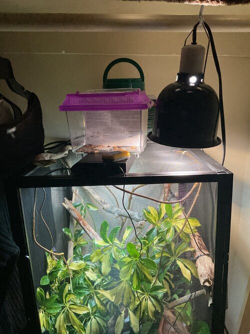 So we went to the vet today and baby Moona unfortunately has a respiratory infection 💔🥺 could have come from the pet store not having taking care of her right plus the stress i admit to putting on her because of the moving most likely but she said it wasn’t my fault. They were so nice with her and she was a good girl . They Prescribed her some antibiotics to give her every 24 hours orally, the first dose didn’t go well because she moved and it got on her face but I’m hoping it doesn’t affect her because i saw her lick some off. shes gaping even more ,squeaking, and popping. I stayed up late last night getting her enclosure better but I do want to get the bigger one soon. I need a lower wattage bulb because it’s making the temperature over 100 degrees, my room already gets so hot because of floridas weather, so I have a fan running near her cage to cool it down so now it’s in the high 80s .i positioned the light higher to cool it down, she still climbs to the very top where the light is so I’m thinking of just completely taking out the vines Because she’s being a butthead and making me nervous lol. She still won’t eat the worms , the crickets are too small and I don’t want to leave the crickets in there and she won’t eat them bc they will get loose ( hopefully not) or die, i just leave the food there in case she does. my local incredible pets store doesn’t have the Arcadia uvb but they did have reptisun so i got one that could fit for now. They also didn’t have the repashy bug burger but they do have other repashy gut loading products , I didn’t want to get either unless I was sure what was in it or what it does so I just waited until I could get help from someone on here. i really hope to get Moona better very very soon.🖤🥺