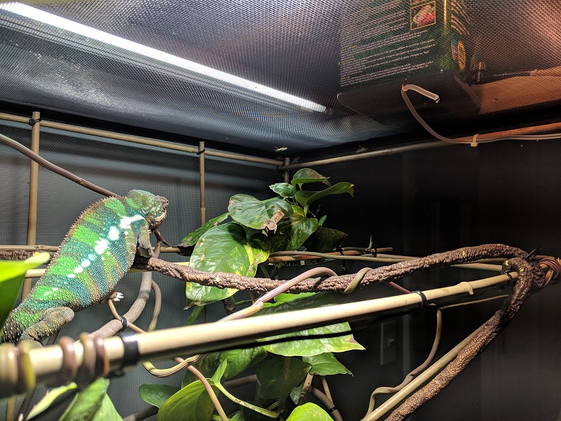 - Watering - What kind of watering technique do you use? How often and how long to you mist? Do you see your chameleon drinking? I must with a pressure mister heavily in the morning and a few times throughout the day, enough to get some water built up on leaves and keep my humidity up, have seen him drink a little here and there, and he also comes up to get some mist when I'm spraying, also have a dripper set up to cascade down the leaves.