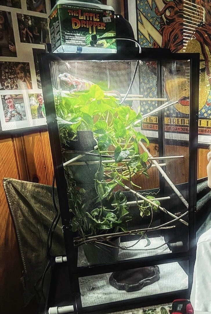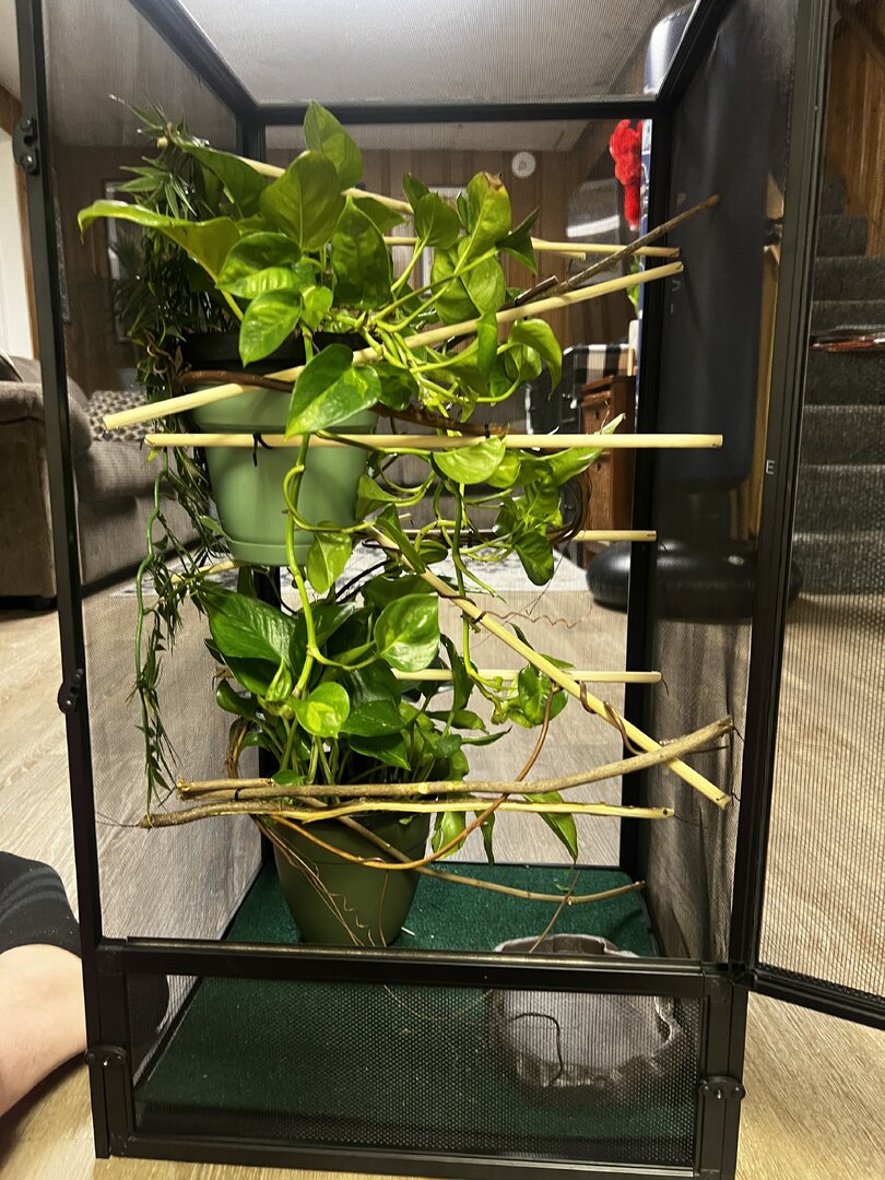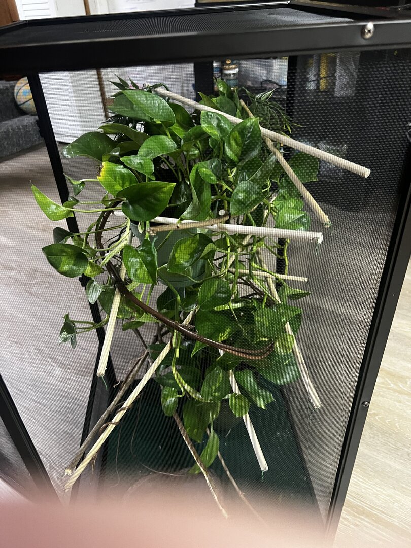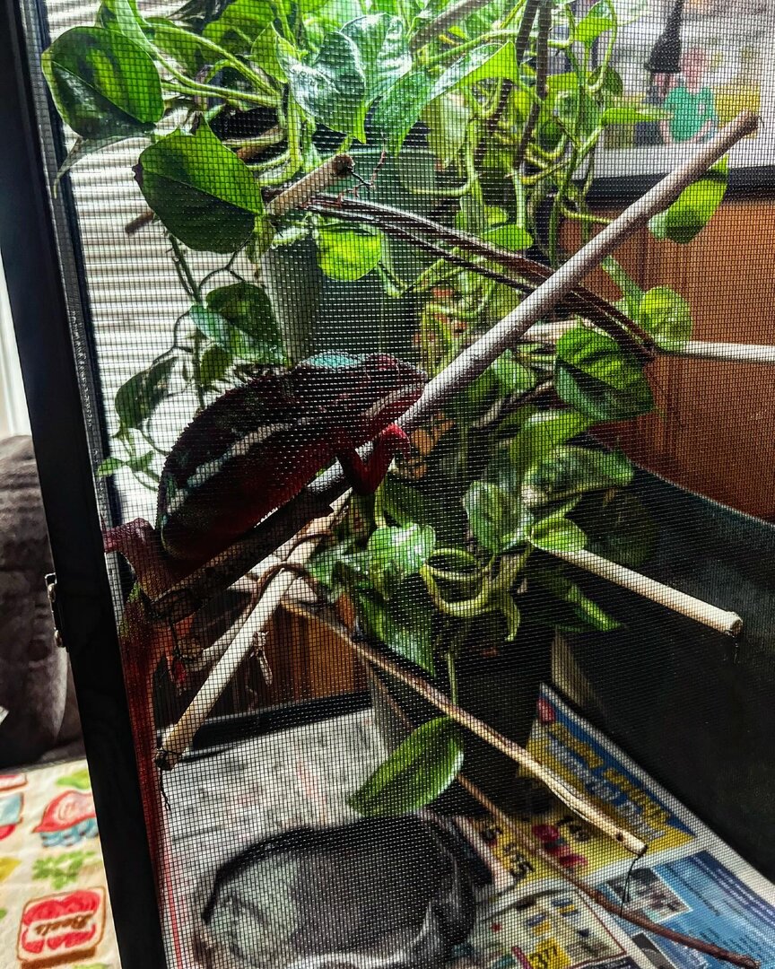 Hello all. I have a new panther Chameleon named Curry. Hes been with me for a week now. For whatever reason he always seem to want out if his enclosure. He has the medium reptibreeze chameleon enclosire. Soon i want to upgrade to the XL. I cant figure out why he always wants out. Basking temp is between 85-88. The rest of the cage sits around 70-72 during the day. The humidity levels are good. He is eating and his poop is healthy but he just doesnt like it in there it seems. He climbs to the top and digs at it like he wants out. Or he comes to the door and trys to get out. Maybe it’s just because it’s new and hes still adjusting. The only other thought is that i need more plant cover, but he mever really tries to hide in whats there anyways, he usually just hangs out at the top basking area. Any help or any ideas on how i can make him happier in his space is greatly appreciated. Thank you!